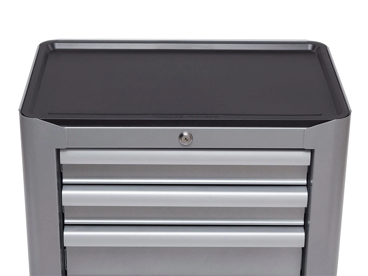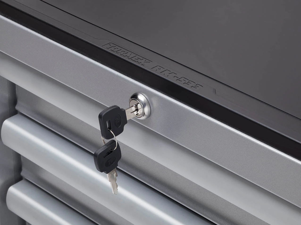 Single, centralized lock with a key at the top secures all drawers.