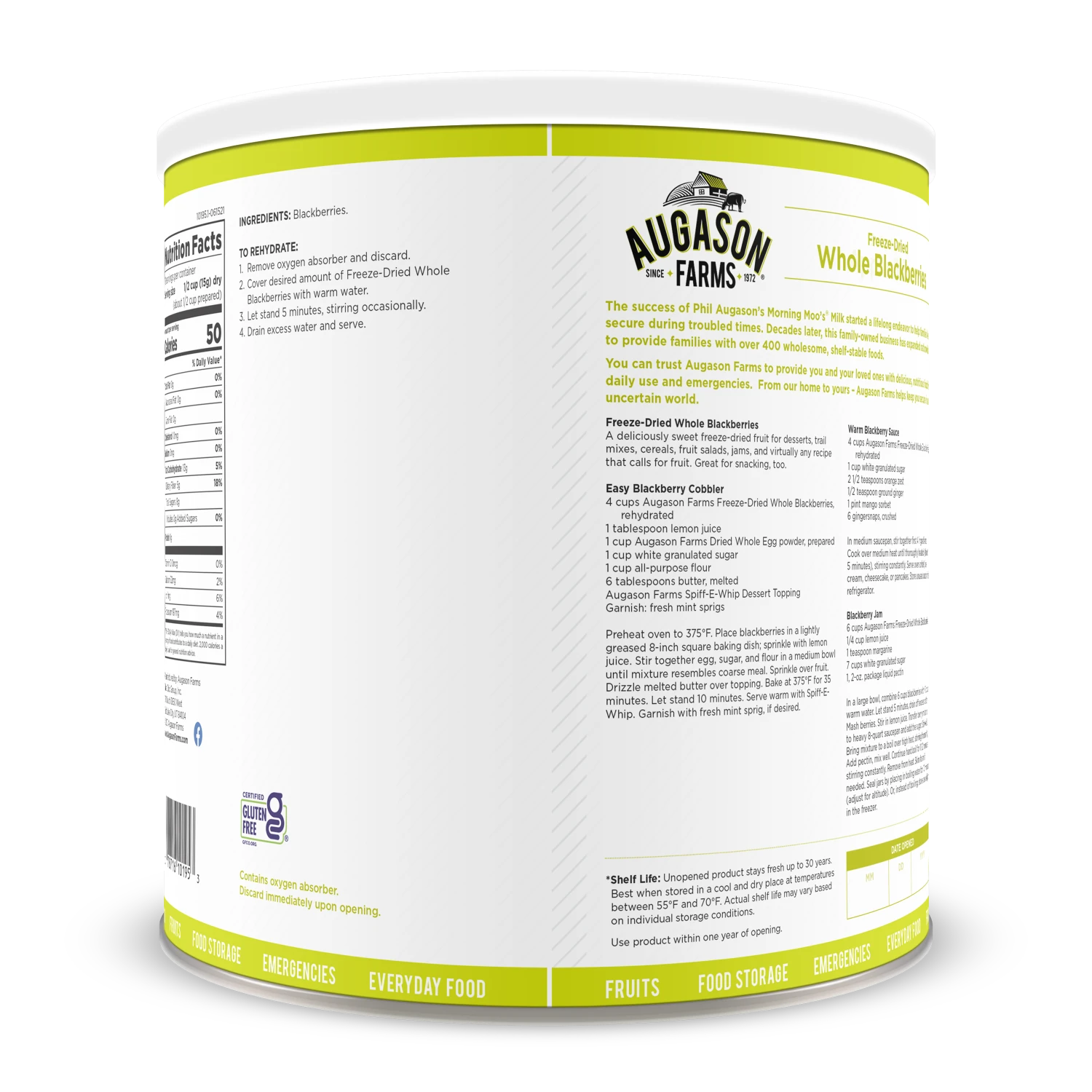 With Augason Farms Freeze Dried Whole Blackberries, you get all the flavour and nutritional benefits of its fresh counterpart without the limited shelf life! Add this gluten free berry to your morning cereal or yogurt, in your trail mix, or to your fruity salad for a punch of tart and sweet flavour along with important vitamins, antioxidants and fiber.
