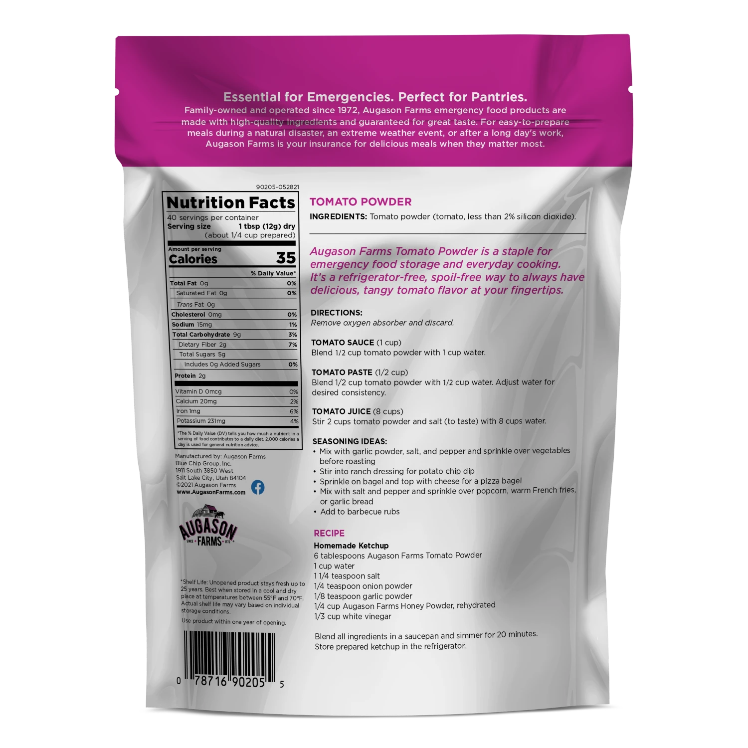 Perfect for soup mixes, sauces, and meatloaf, Augason Farms Tomato Powder is an essential item to add to any emergency food kit. It can be easily reconstituted into tomato paste, tomato sauce, and tomato juice. Just add the indicated amount of water and blend until the desired thickness is achieved.Â