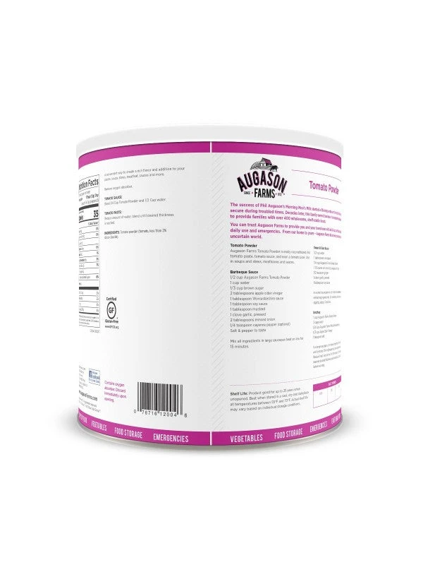 Perfect for soup mixes, sauces, and meatloaf, Augason Farms Tomato Powder is an essential item to add to any emergency food kit. It can be easily reconstituted into tomato paste, tomato sauce, and tomato juice. Just add the indicated amount of water and blend until the desired thickness is achieved. Tomato Powder is certified gluten free.