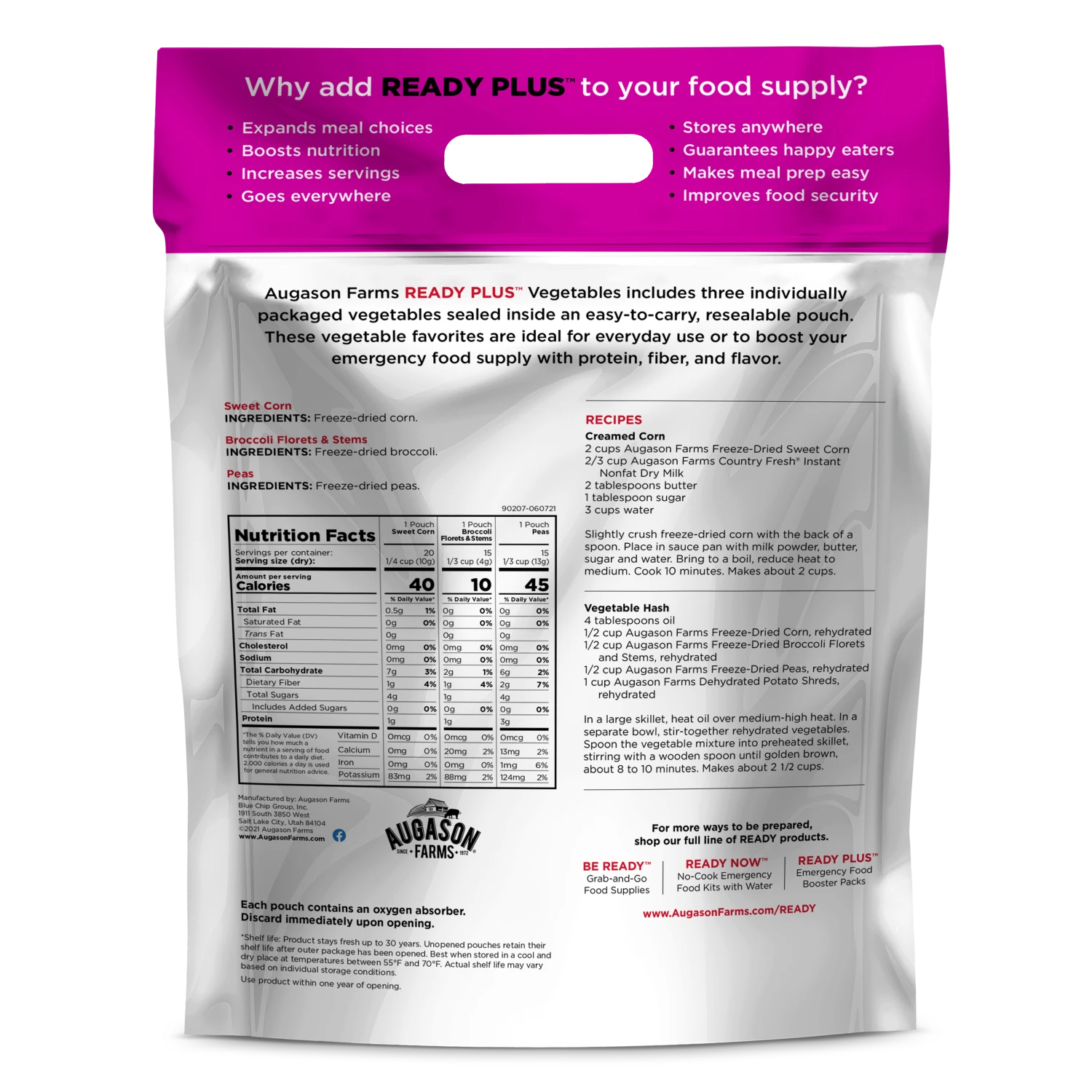Augason Farms Vegetable Variety Pouch includes three individually packaged vegetables sealed inside an easy-to-carry, resealable pouch. This delicious combination makes it easy to have a wide variety of vegetables to use in soups, salads and side dishes. Perfect for everyday use, camping and backpacking, or long-term emergency food storage.