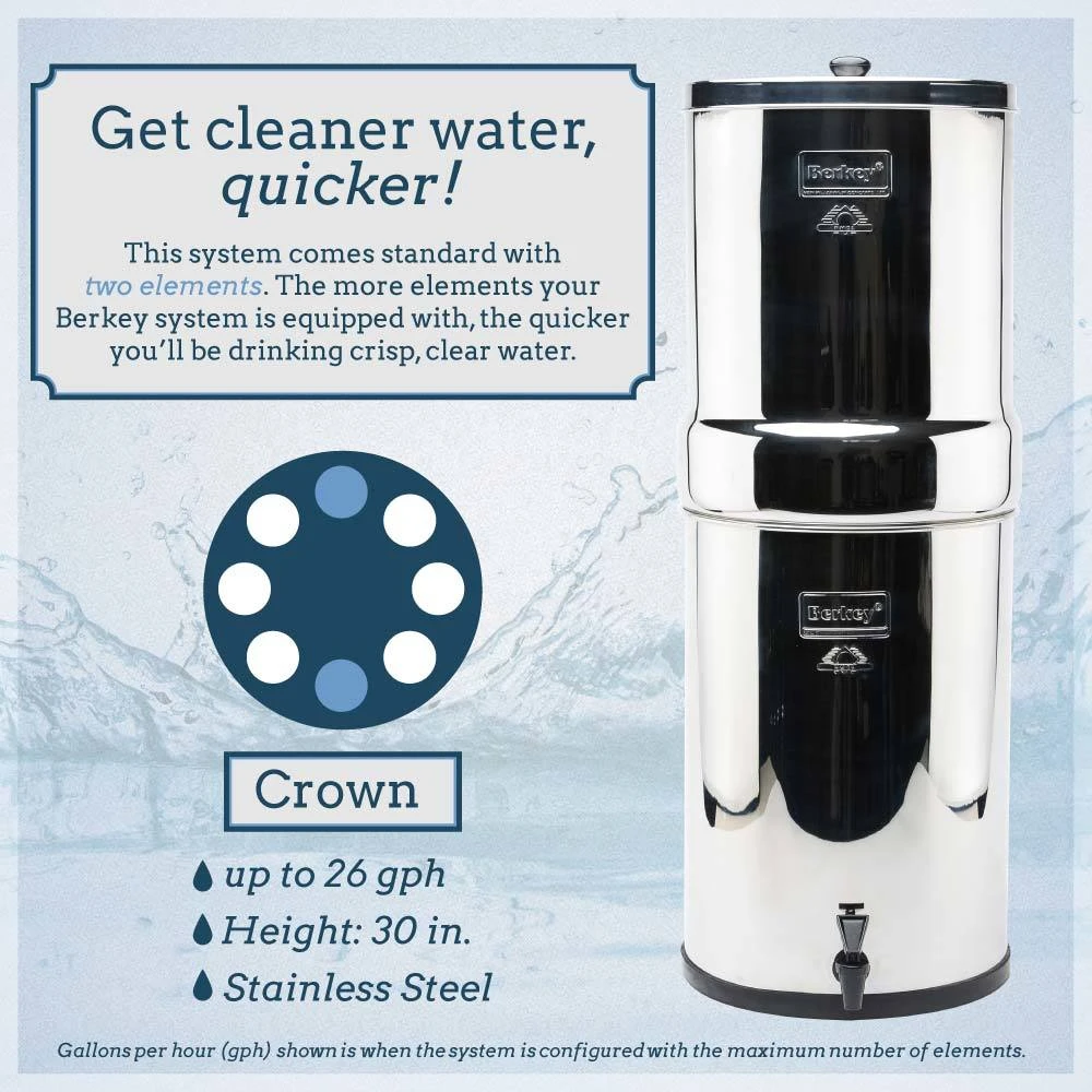 - The Crown Berkey System comes standard with two Black Berkey Purification Elements but can be expanded up to 4, 6, or 8 elements