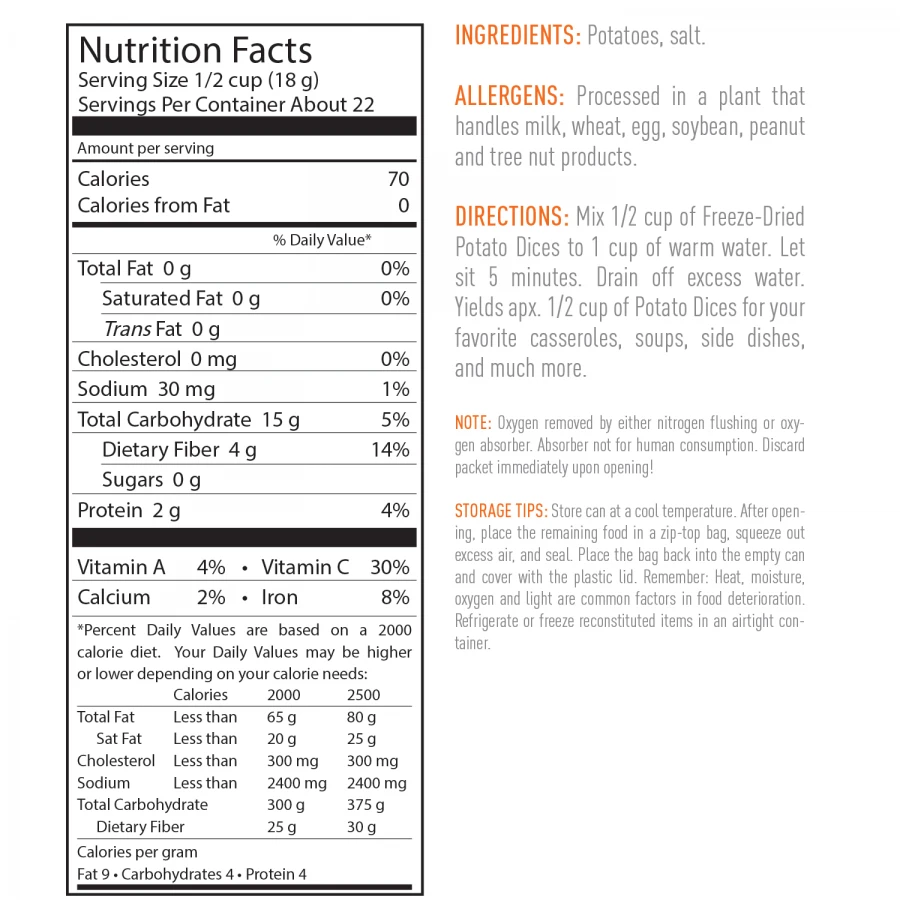 | Specifications and Shelf Life | Product specifications listed above may differ slightly from those on actual product labels due to occasional changes in raw-ingredient suppliers. Please refer to printed product labels for final specifications. *Shelf life up to 30 years when unopened. Best when stored in a cool and dry place at temperatures between 55 F and 70 F. Actual shelf life may vary based on individual storage conditions. |