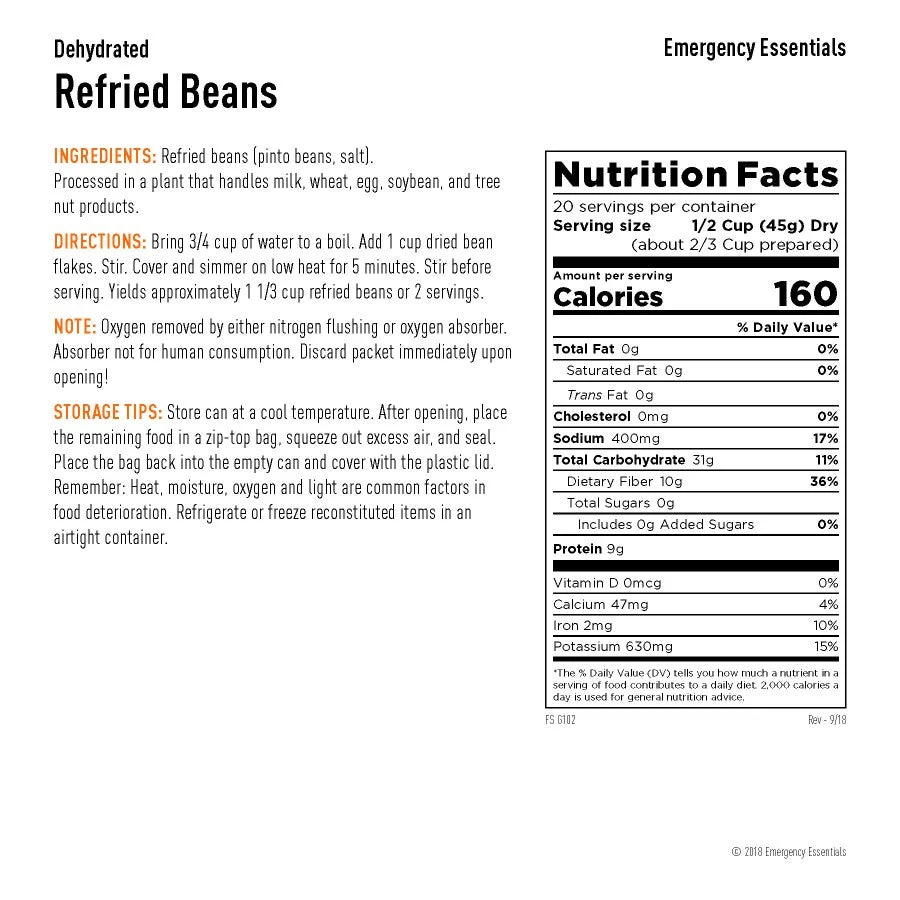 Emergency Essentials Refried Beans are dehydrated and packaged for long-term storage, so you can use them now or in the years ahead. A nutritious and versatile addition to your emergency food storage. Use to make many of your favourite Mexican dishes. Simple to use and can be ready in just 5 minutes. An excellent source of dietary fiber and protein. A good source of iron.