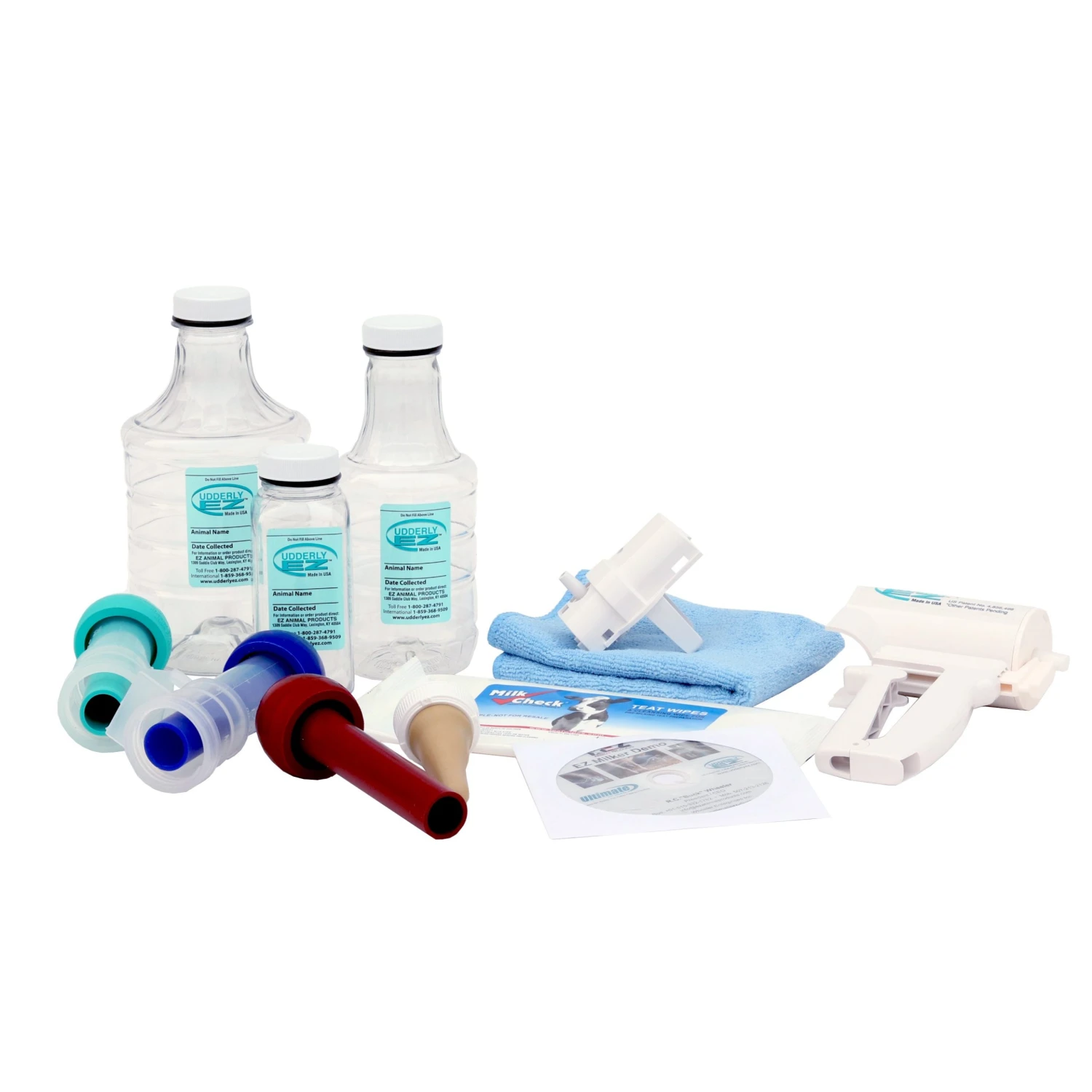 The Udderly EZ™ Cow & Miniature Cow Milker #EZ003, our cow milking machine, is the safest and most effective hand held, trigger-operated vacuum pump available. Ideal for the collection of colostrum and the milking of a family cow. It is invaluable in the treatment of mastitis, and as an aid for someone not too experienced in hand milking. Very handy in the collection of colostrum for the newborn calves and for the collection and storing of colostrum. The EZ Cow Kit comes with one Quart and One Pint bottle and two rubber inserts.