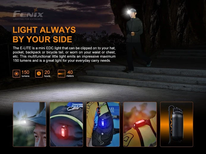 The Fenix E-LITE is a multipurpose super mini light that can be clipped on a hat, pocket, backpack, bicycle tail or worn on your waist or chest. It has two lights: one on top which provides three brightness levels from 5 to 150 lumens for daily lighting needs, and another in front that provides eye-catching red and blue lights for signal transmission in emergency conditions. Additionally, it is fitted with a Type-C charging interface.
