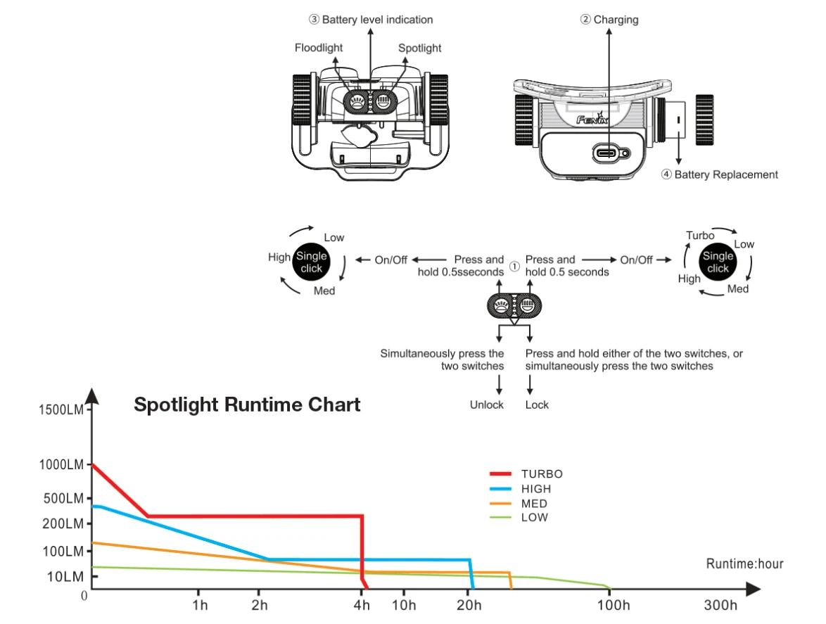 The Fenix HM65R headlamp features both an independently controlled spotlight and a floodlight for a combined maximum 1400 lumens of neutral and white light. The HM65R can spotlight and floodlight independently, or combined. Powered by the included 18650 battery, this headlamp is USB-C rechargeable and includes a battery level indicator. It is made of a magnesium alloy for better strength, impact resistant to 2 meters (6.6ft), with less weight. Plus it is completely dustproof and waterproof to 2m. The perforated reflective headband reduces weight and creates a more comfortable feel. Use the optional top headband for a more secure fit. Perfect for work or outdoor adventures, and those needing extremely bright hands-free lighting and long runtimes in a small, light-weight package.