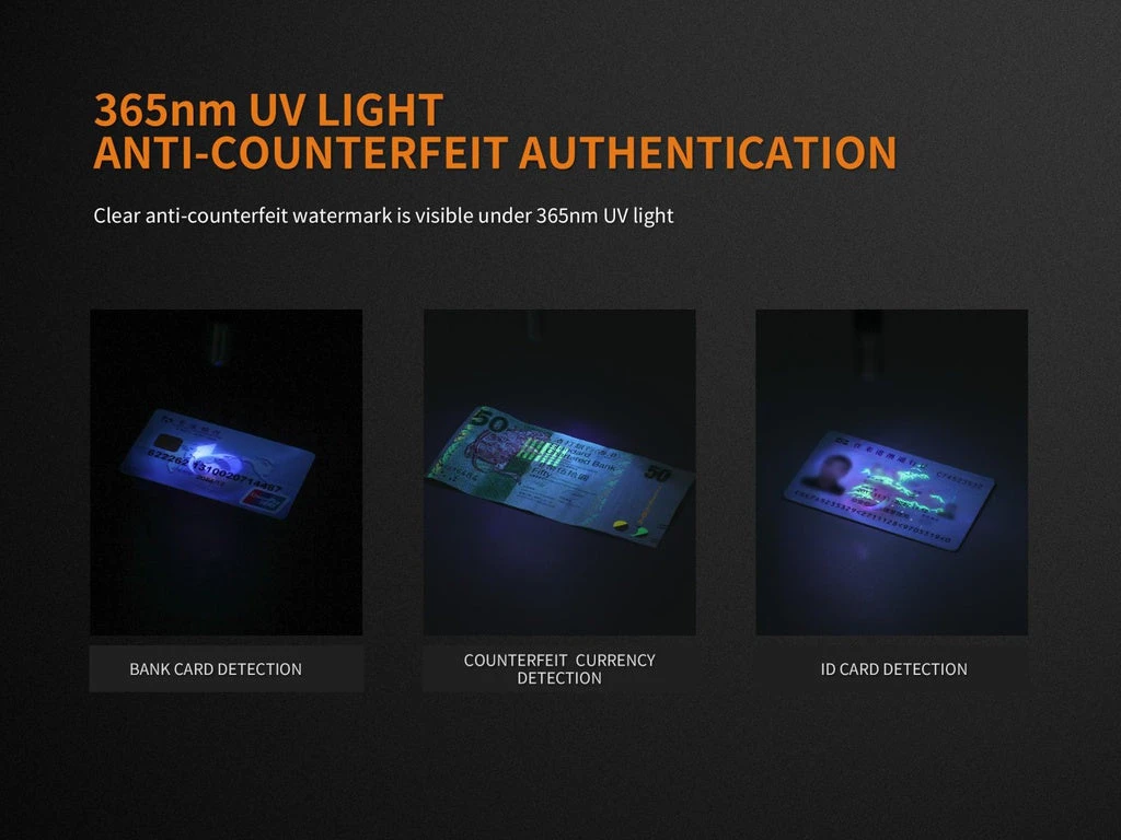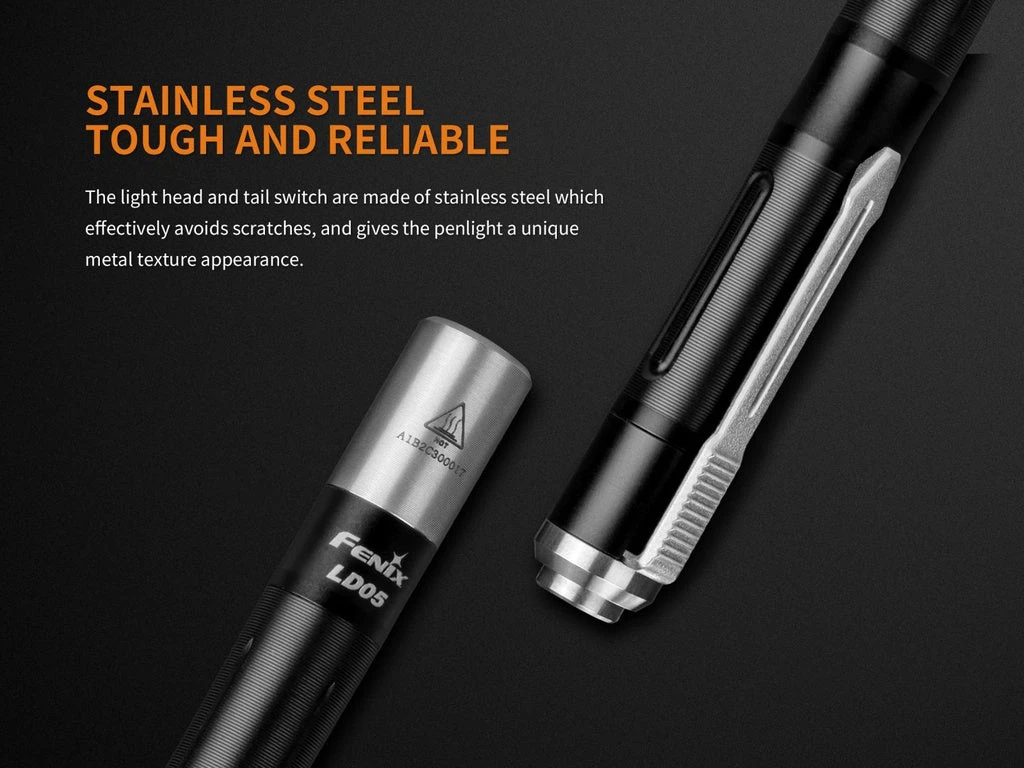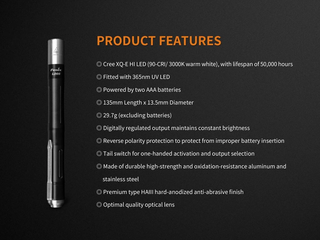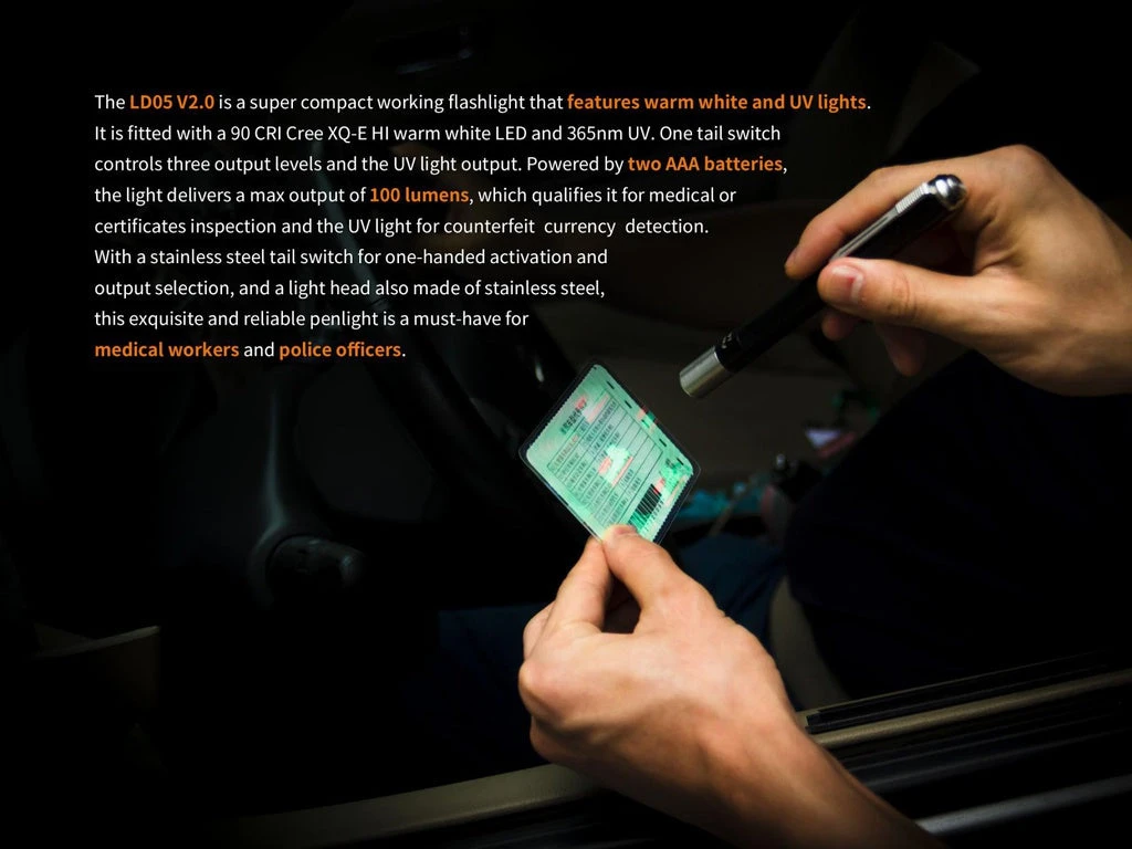 Fenix LD05 V2.0 is a super compact working flashlight that features warm white and UV lights. It is fitted with a 90 CRI Cree XQ-E HI warm white LED and 365nm UV. One tail switch controls three output levels and the UV light output. Powered by two AAA batteries, the light delivers a max output of 100 lumens, which qualifies it for medical or certificates inspection and the UV light for counterfeit currency detection. With a stainless steel tail switch for one-handed activation and output selection, and a light head also made of stainless steel, this exquisite and reliable penlight is a must-have for medical workers and police officers.