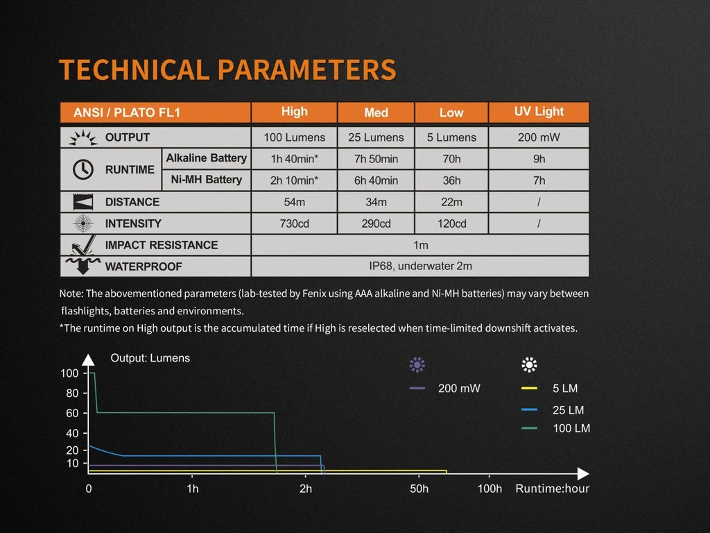 | ANSI FL1 Rating | High (Ni-MH / Alkaline) | Medium (Ni-MH / Alkaline) | Low (Ni-MH / Alkaline) | UV (Ni-MH / Alkaline) |
