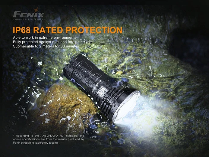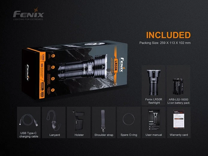 The Fenix LR50R is a super bright flashlight made for search and rescue. This monster light emits a truly remarkable output of 12000 lumens with a max beam distance of 950m. Dual stainless steel side switches allow you to quickly activate and cycle through the six general brightness levels and functional modes including, instant turbo, strobe and SOS. With the included USB Type-C charging port you can fast charge the Fenix LR50R in a matter of hours or use the discharge function to charge your other devices. A user-friendly intelligent brightness downshifting sensor function is designed to avoid high temperature at close-range lighting. Choose between the versatile modes to easily adapt to your surroundings, this flashlight is the perfect tool for exploring and search and rescue.