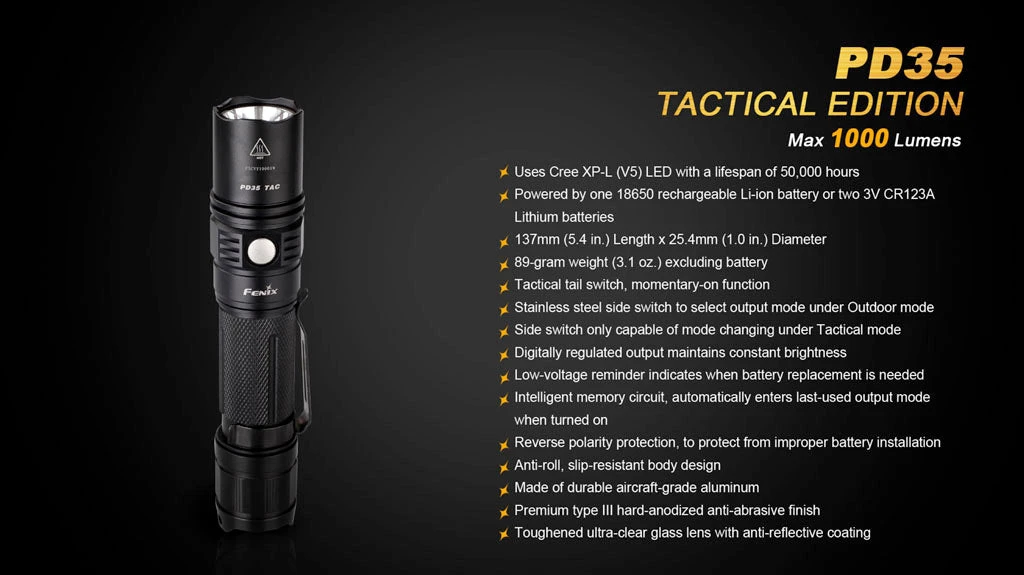 The Fenix PD35TAC (Tactical Edition) LED Flashlight, remains in it’s pocket-size form but surpasses the traditional PD35 in performance and tactical employment.