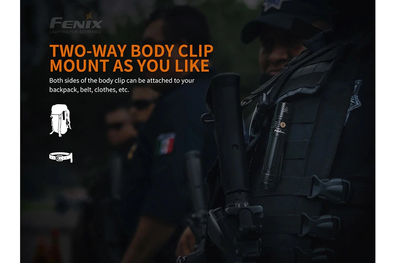 Designed for tactical and professional applications, the Fenix PD36R Tactical Flashlight has an assortment of different features, including a max output of 1600 Lumens on the turbo setting which casts a beam distance of 928 feet. In terms of size, the light is only 5.35 inches in length and 1.04 inches in diameter. Made with a high-strength aluminum, this powerful flashlight can handle the elements and a drops of 1.5 meters on all sides. To protect all that functionality, the Fenix PD36R has been IP68 waterproof rated, allowing it to withstand being underwater up to 6.5 feet for 30 minutes. A quick tap of the PD36R’s rear tactical switch will instantly activate the flashlight, while a full press will leave the flashlight turned on. Do you need more power? No need to worry; Fenix has integrated an all-new ARB-L21-5000 mAh (21700) rechargeable battery with the Fenix PD36R that lasts longer than the typical 18650 battery. This new battery can be quickly charged with the included USB Type-C charging cable that plugs right into the flashlights charging port. Battery status can be seen on the flashlights side switch which lets you know when it’s time to charge your torch. Carrying the Fenix PD36R is a breeze with the innovative two-way body clip that attaches to backpacks, belts, and clothes. Upon purchasing the Fenix PD36R Tactical rechargeable flashlight, you will receive a durable holster, lanyard, O-ring, battery, charging cable and user manual.