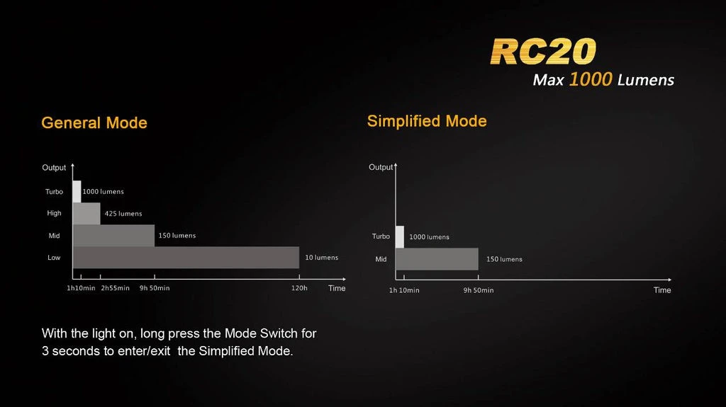 With tailored rechargeable Li-ion battery and standard USB charging cradle, Fenix RC20 simplifies the way of charging. Whether the charging cradle is fixed in the wall or placed in the car, you only need to plug into the flashlight. Moreover, the indicator light in the neck of the flashlight will present battery power level well. RC20 lights up long-distance view of 290 meters with its 1000 maximum lumen output. Dual tail switch features remarkable tactical ability and easily activates 4 brightness levels plus instant strobe and momentary-on function. Dual operation mode makes it better to satisfy the demand for law enforcement, driving, searching and rescuing, etc.