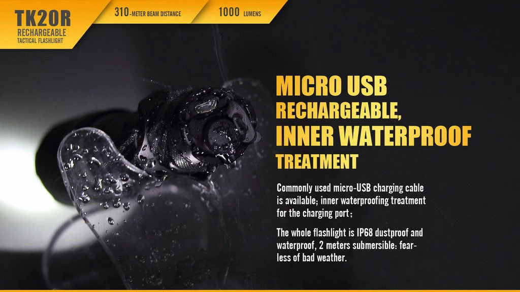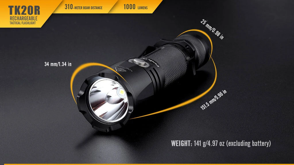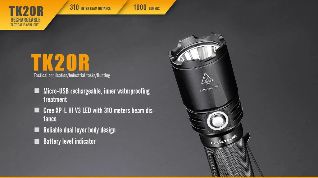 Fenix TK20R is a Micro-USB rechargeable flashlight that is designed for tactical applications. It delivers a maximum beam distance of 310 meters by utilizing a CREE XPL HI V3 LED, and has a max output of 1000 lumens. In addition, it is powered by one 18650 rechargeable Li-ion battery, and two cold resistant CR123A can be used as standby batteries. Features are dual layer body, inner waterproofing treatment; and a tactical tail switch and side switch that allow easily access to four output levels and strobe. This compact but hardy flashlight is ideal for tactical application, industrial tasks and hunting.