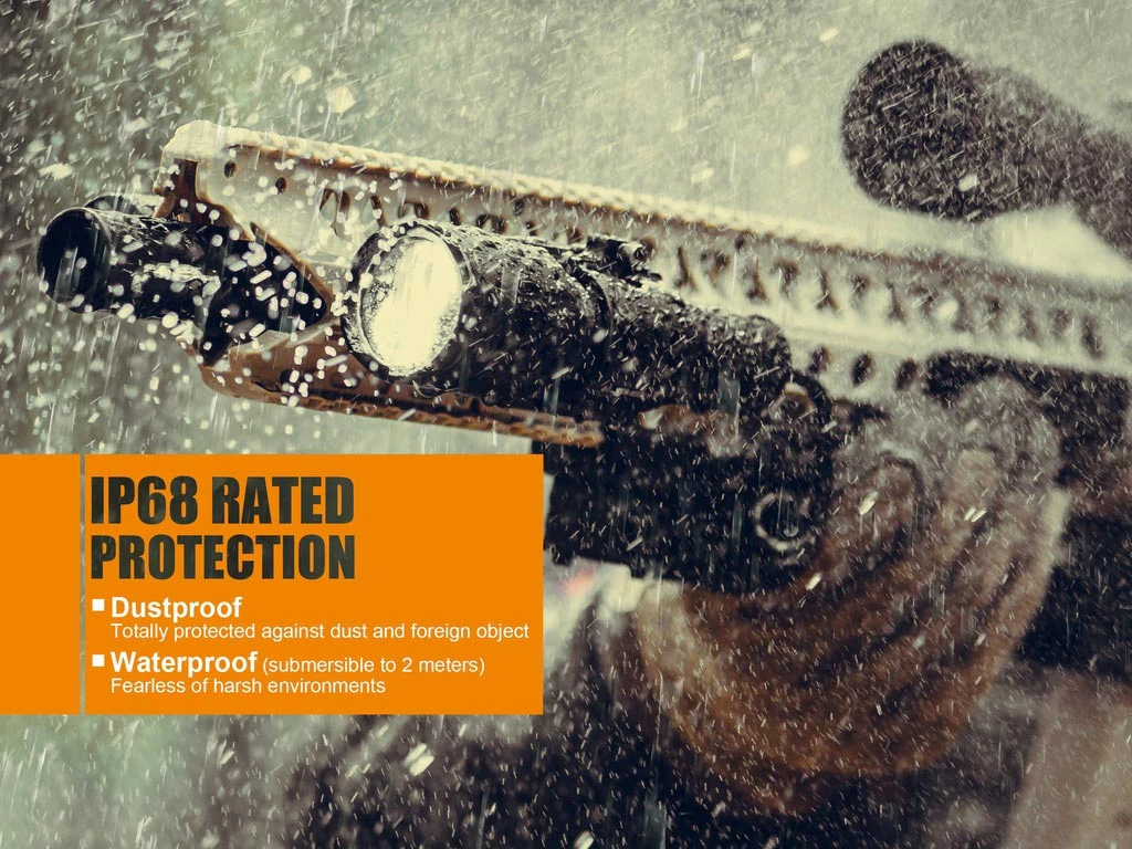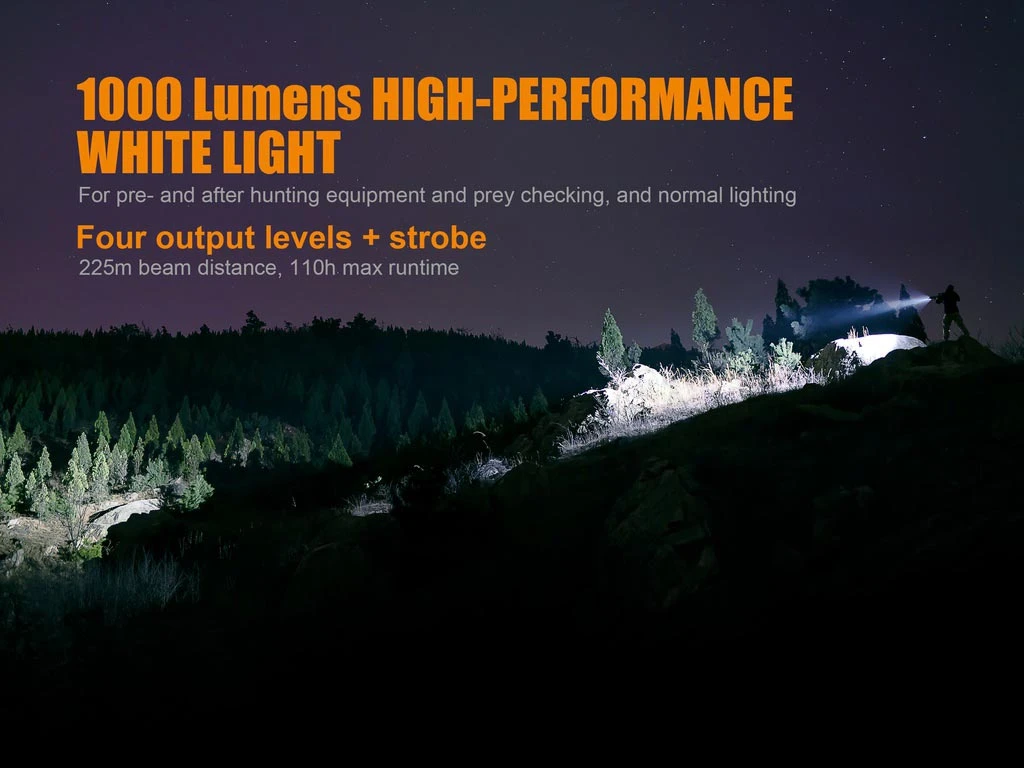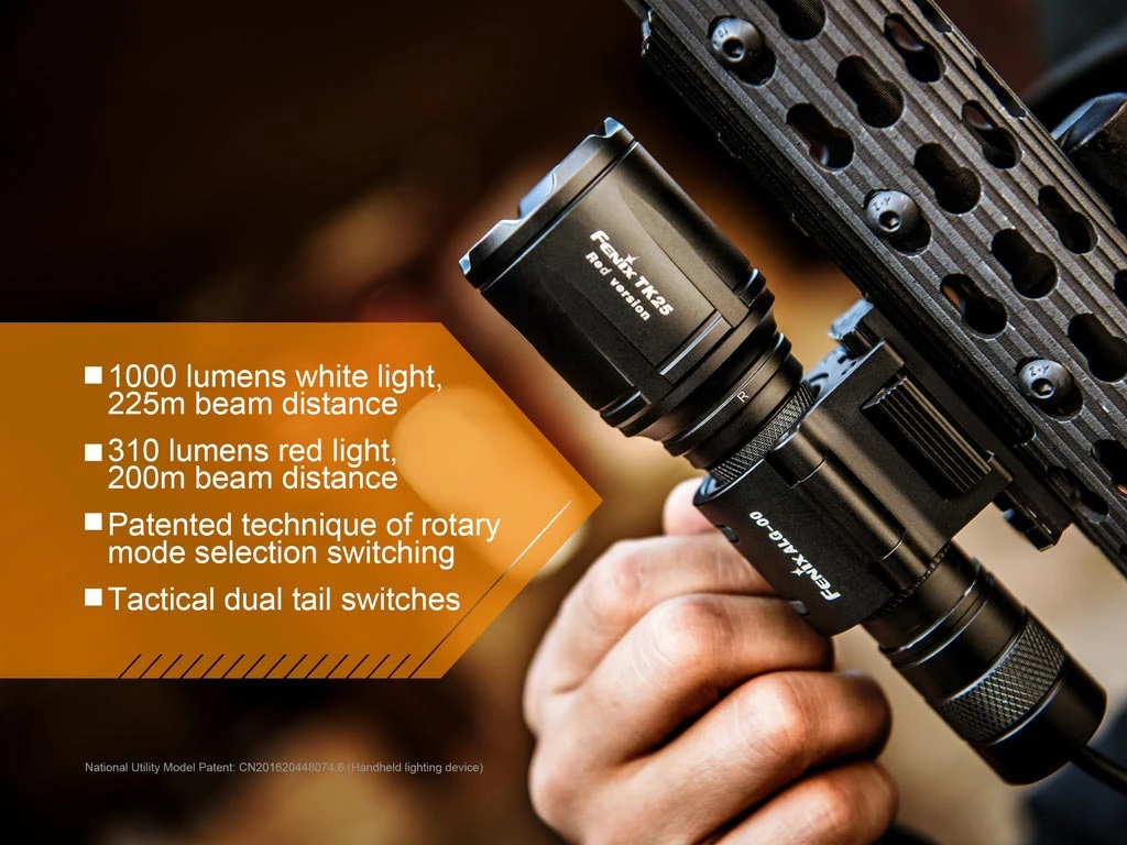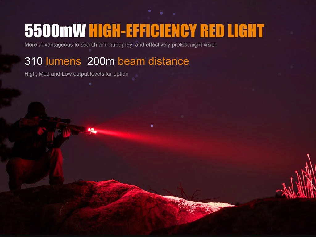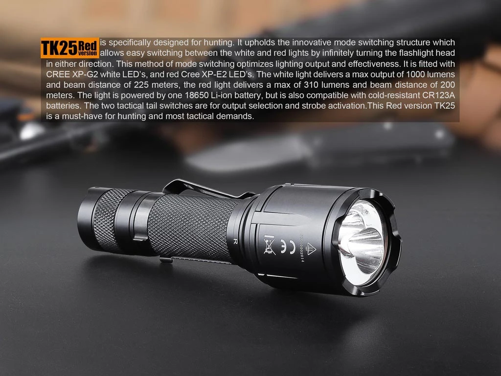 The TK25 Red version is specifically designed for hunting. It upholds the innovative mode switching structure which allows easy switching between the white and red lights by infinitely turning the flashlight head in either direction. This method of mode switching optimizes lighting output and effectiveness. It is fitted with CREE XP-G2 white LED’s, and red Cree XP-E2 LED’s. The white light delivers a max output of 1000 lumens and beam distance of 225 meters, the red light delivers a max of 310 lumens and beam distance of 200 meters. The light is powered by one 18650 Li-ion battery but is also compatible with cold-resistant CR123A batteries. The two tactical tail switches are for output selection and strobe activation.