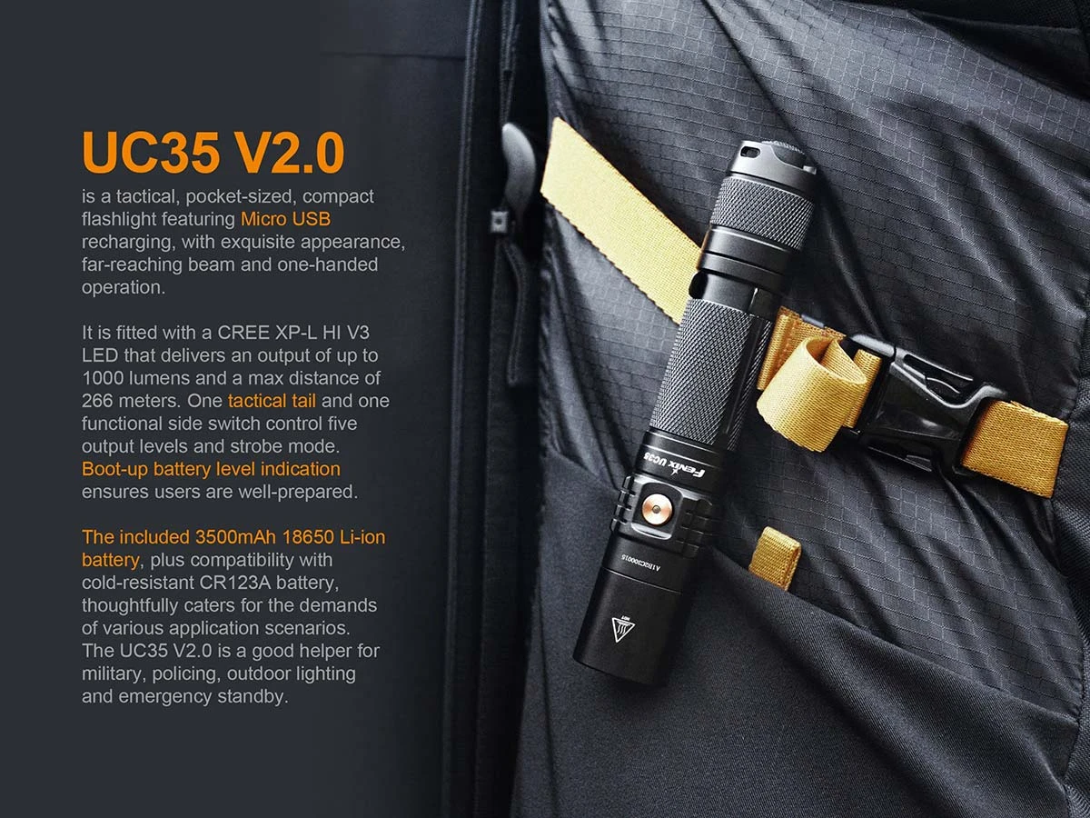 The Fenix UC35 V2.0 is a tactical, pocket-sized, compact tactical flashlight featuring micro USB recharging with included 3500mAh battery, exquisite appearance, far-reaching beam and one-handed operation. It is fitted with a CREE XP-L HI V3 LED that delivers an output of up to 1000 lumens and a max distance of 266 meters. One tactical tail switch and one functional side switch control five output levels and strobe mode. Boot-up battery level indication ensures users are well-prepared for their lighting needs.