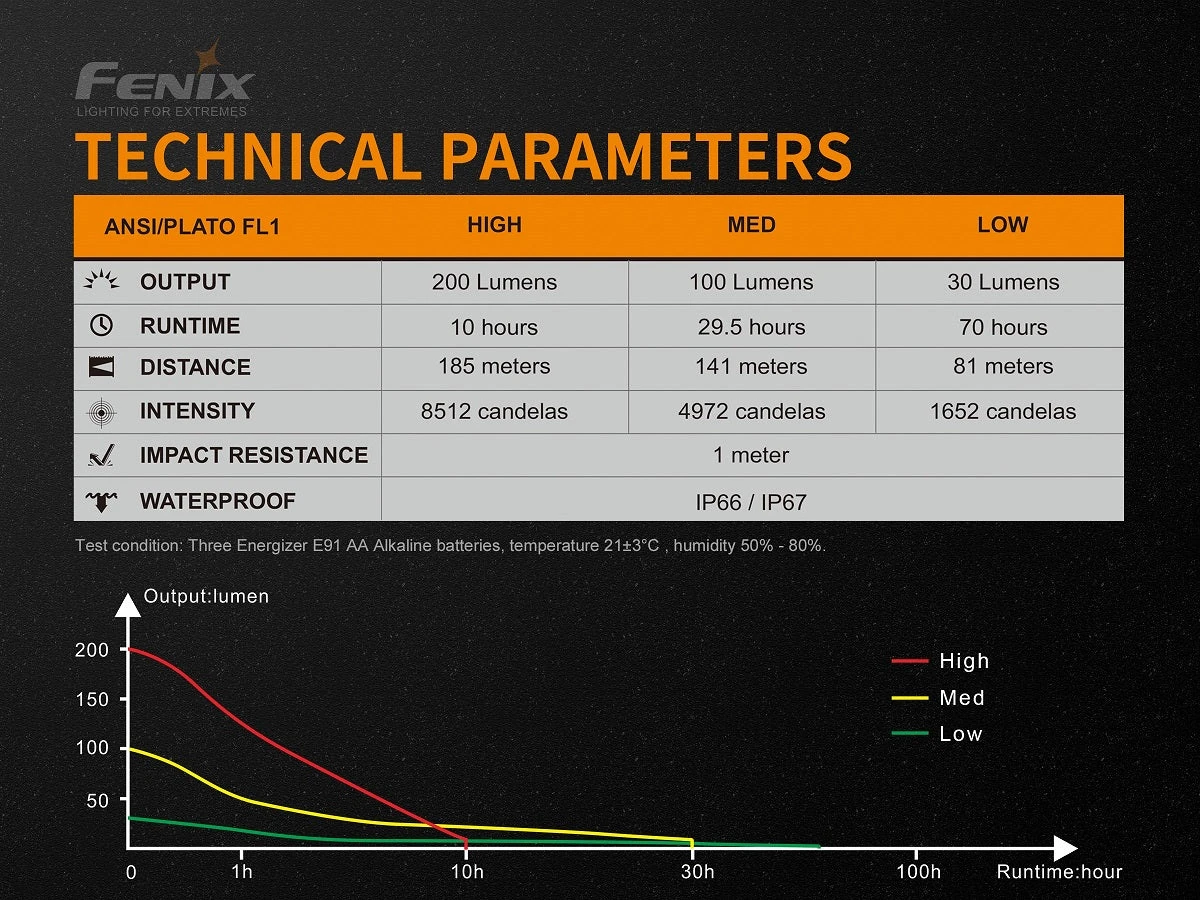 | OUTPUT | 200 Lumens | 100 Lumens | 30 Lumens |