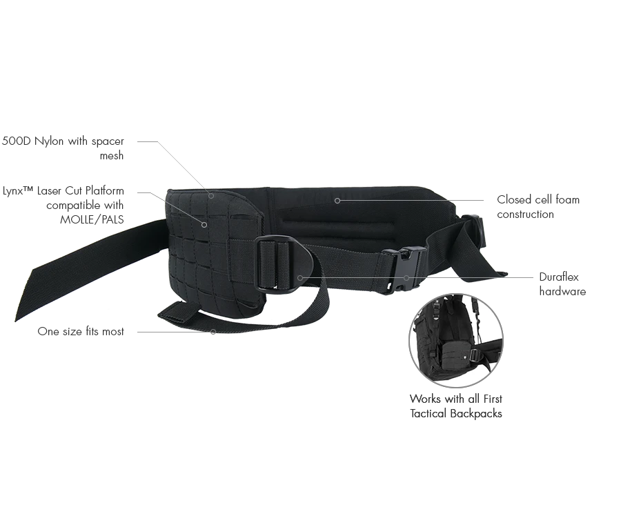 The Tactix Waist Belt is compatible with the entire First Tactical Backpack line. Simply slide the Waist Belt through the tunnel and attach.