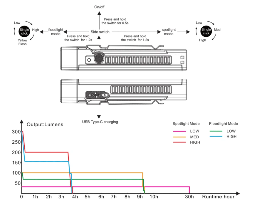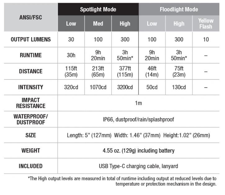 - Two Cree XP-E2 LEDs and COB floodlight source with a lifespan of 50,000 hours