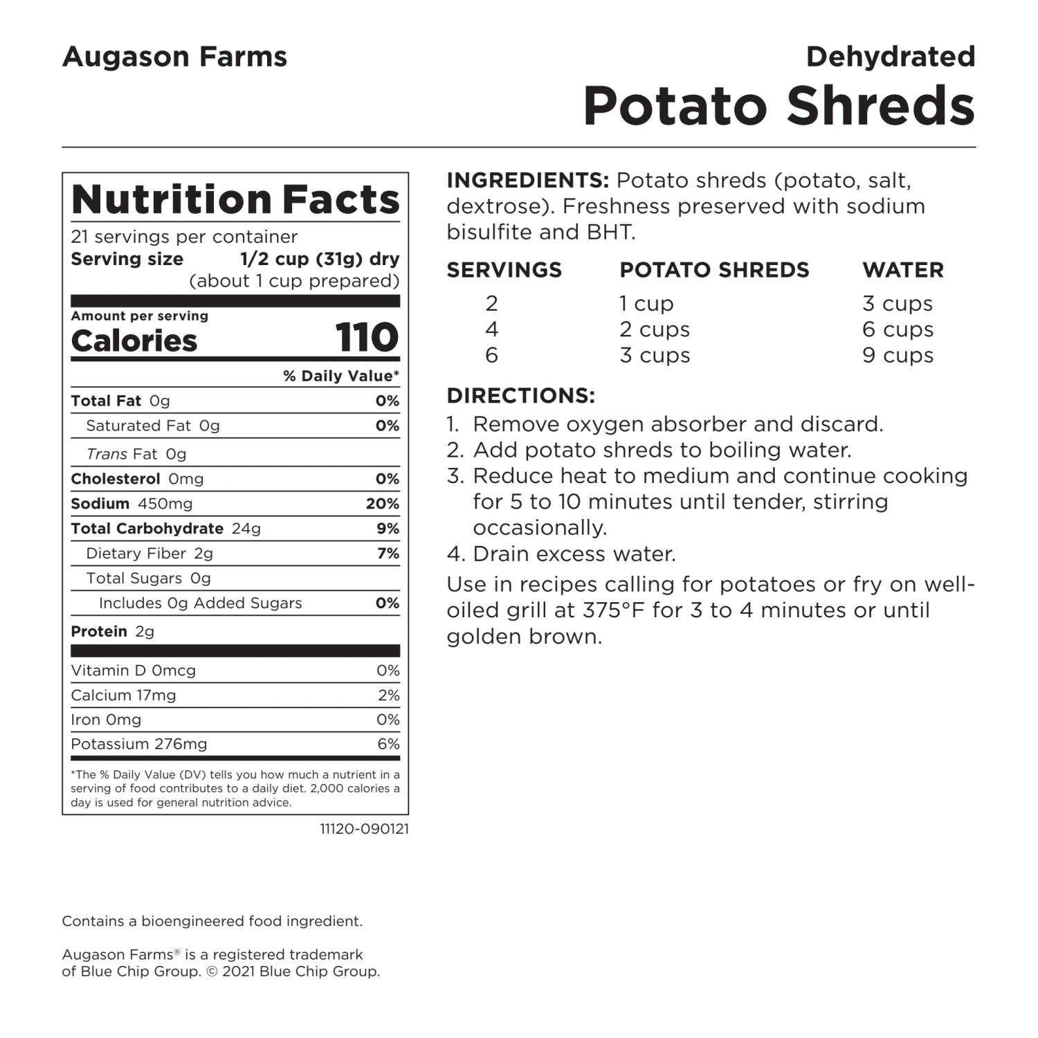 Augason Farms has spent decades perfecting the skill of dehydrating foods like these delicious potato shreds. These Dehydrated Potato Shreds maintain their nutritional benefits during the dehydration process and are a good source of vitamin C. Use them with your favourite entrée recipes, pair them with Augason Farms dehydrated vegetables and vegetarian meats, or store them for later use in your emergency food storage. Potato Shreds are certified gluten free.