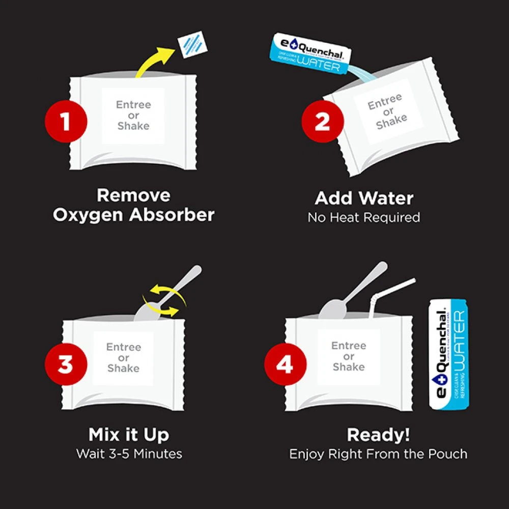 MEALS ARE EASY TO PREPARE and do not require emergency or camping cookware. Steakhouse Potatoes and Maple Brown Sugar Oatmeal are prepared by adding water to the pouch, stirring, and letting stand for three to four minutes. The Protein Shake is prepared by adding water and stirring until dissolved. Enjoy meals straight from the pouch and drink the extra water to help you stay hydrated.