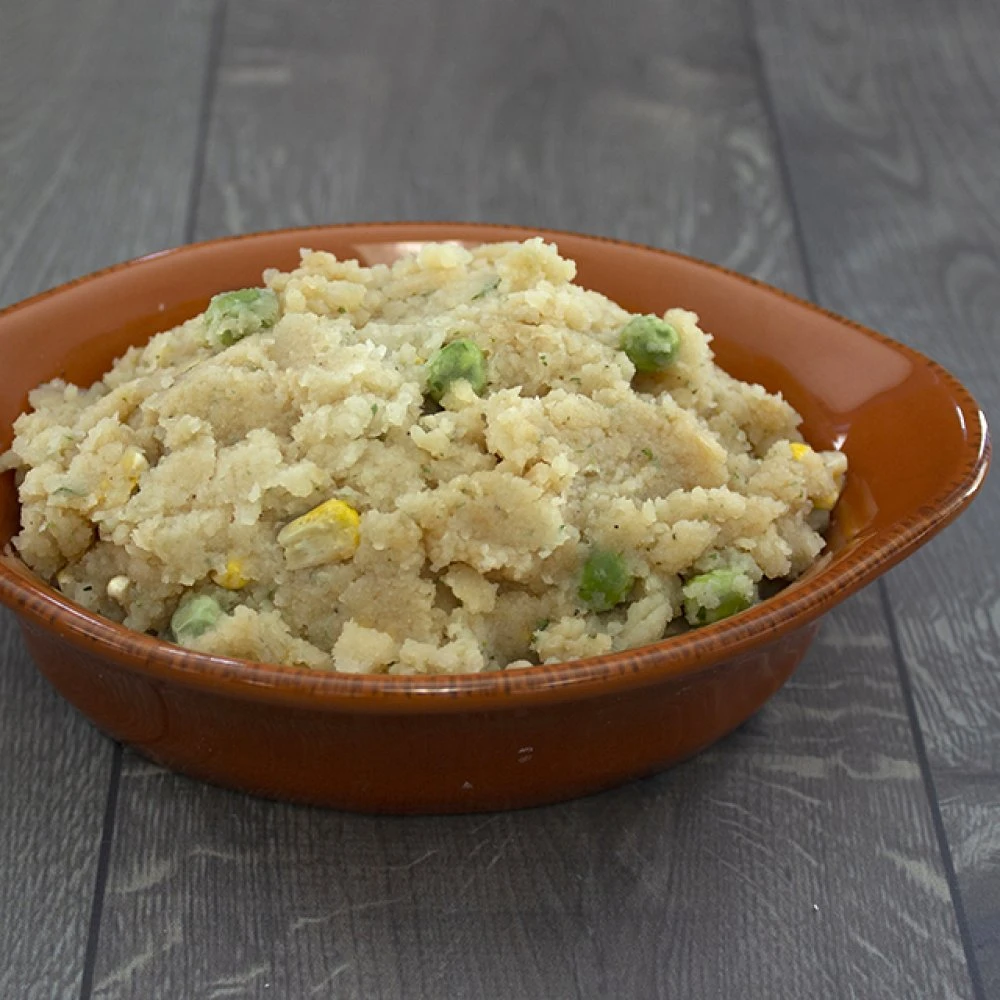 - Steakhouse Potatoes (290 calories/12g protein) made with real mashed potatoes flavoured with vegetarian beef base, mushroom stock, real milk, and loaded with corn, peas, and parsley