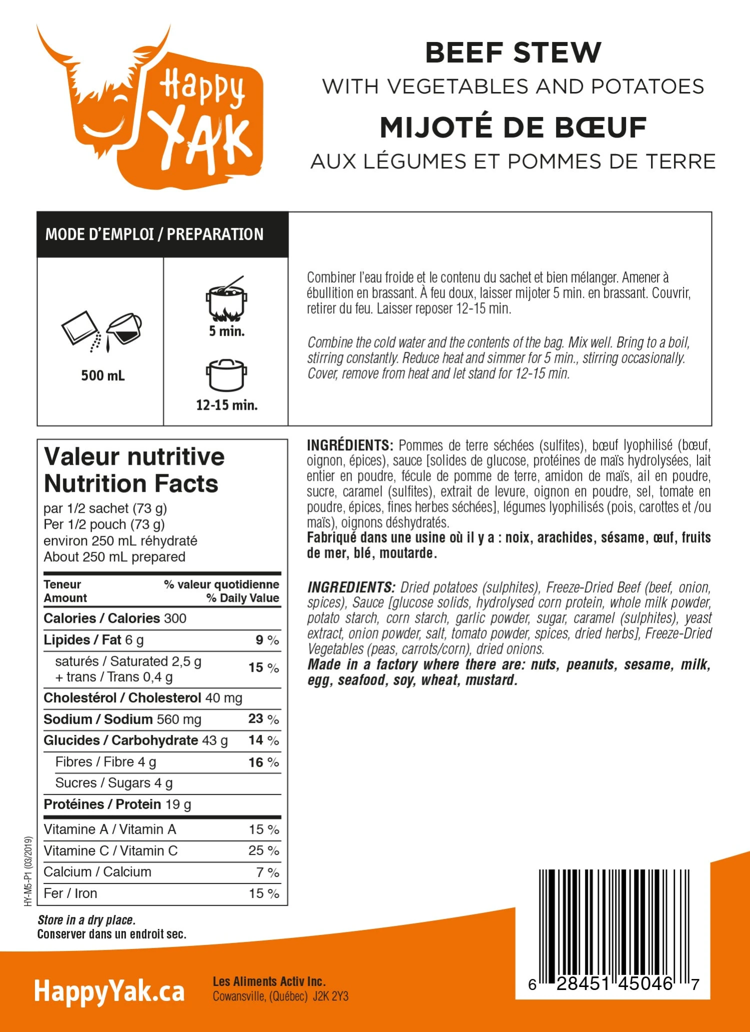 The ultimate traditional meal for generations! Although there are countless variations, you’ll love our tender beef, vegetable and potato stew. With just the perfect balance of flavours, fans will be tantalized with this classic comfort dish! Pour the contents of the pouch into a pot, cook as indicated and enjoy!