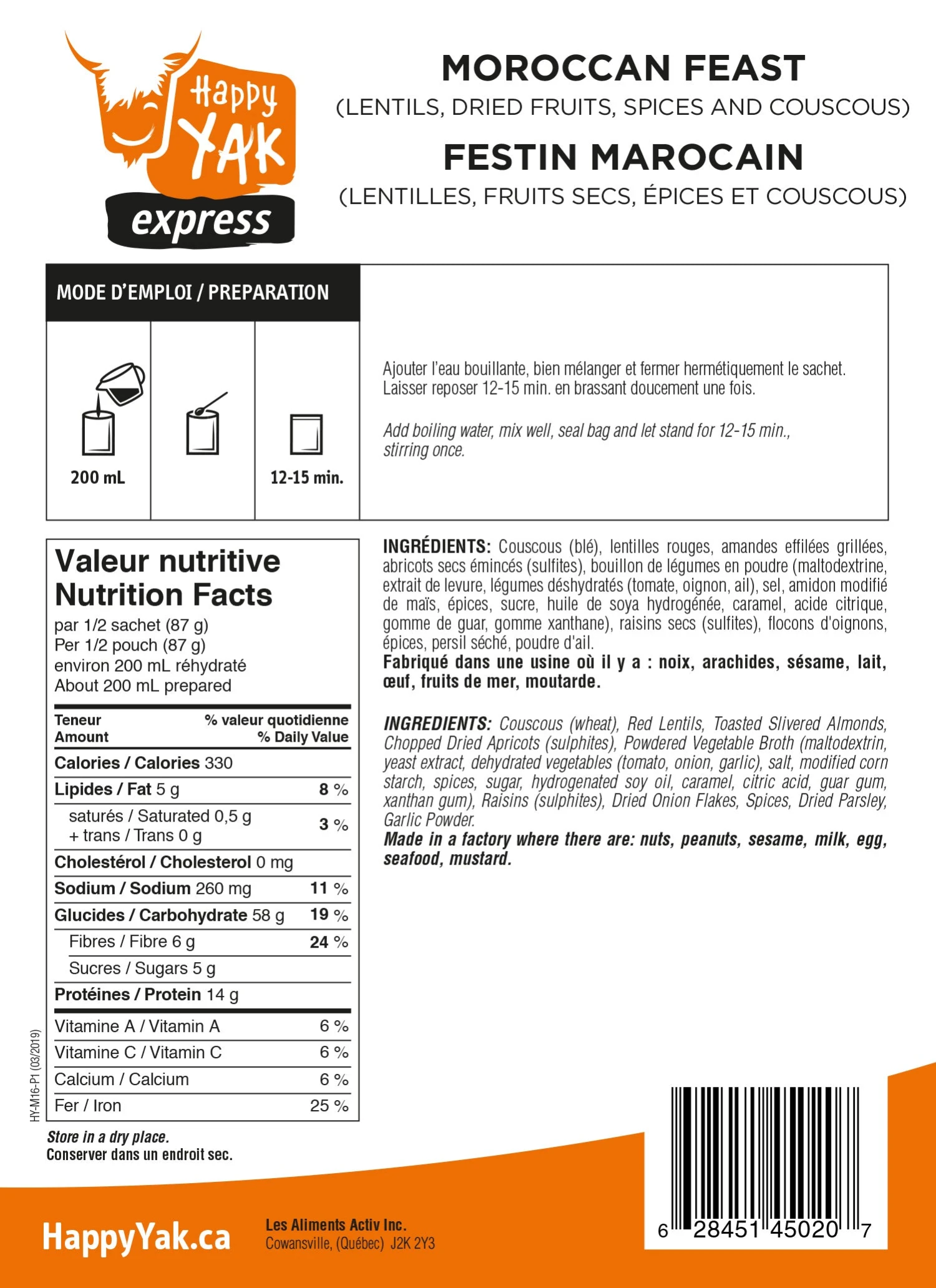 Happy Yak lentil couscous is inspired by festive Moroccan gastronomy. In this North African country there are many dishes based on lentils, white beans, kidney beans and couscous. Simple and easy to prepare, this express, vegan and lactose-free meal contains 28g of protein and will be enjoyed by all!