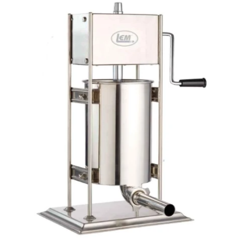 The “90 degree” handle of the Big Bite Dual-Gear Stuffer gives you excellent leverage and makes cranking easier than ever. Designed exclusively for LEM, this heavy-duty dual gear stuffer is the best you can buy. The huge drive gear notched piston rod, and all-metal gears are built to deliver and withstand the pressure needed to stuff even small sausages. Four solid stainless steel bars create a sturdy frame that won’t bend or bow under pressure. The unique two-speed design allows a high speed to raise the piston quickly for filling the cylinder and a low speed for stuffing casings. An air release valve in the piston ensures even pressure and better results, while the heavy-duty rubber gasket seals the cylinder to prevent leaks. The stainless cylinder is removable for easy filling and cleaning. Mounting holes in the base. Includes four stainless steel stuffing tubes (5/8 in, 3/4 in, 1 in and 1.5 in). Also available in a smaller 10 lb. Stuffer (# 1112). This 25 lb. Sausage Stuffer is not recommended for snack sticks. 5-Year Warranty