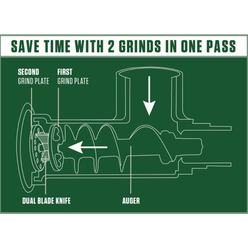 Save time with two grinds in one pass! The New Dual Grind Meat Grinder can cycle through two grinds in a single pass. No more reloading for a second grind. This innovative technology has been used in commercial processing for years, and now we are bringing it to the home processing world! The secret is in the innovative design incorporating a unique double-edged knife and two grinder plates. The result is the quality and consistency of two separate grinds in just one pass. Combined with the Big Bite technology that allows the auger to take an extra big bite of meat and then move it through the grinder quicker than other grinders, you will get a premium grind in half the time!
