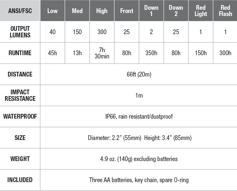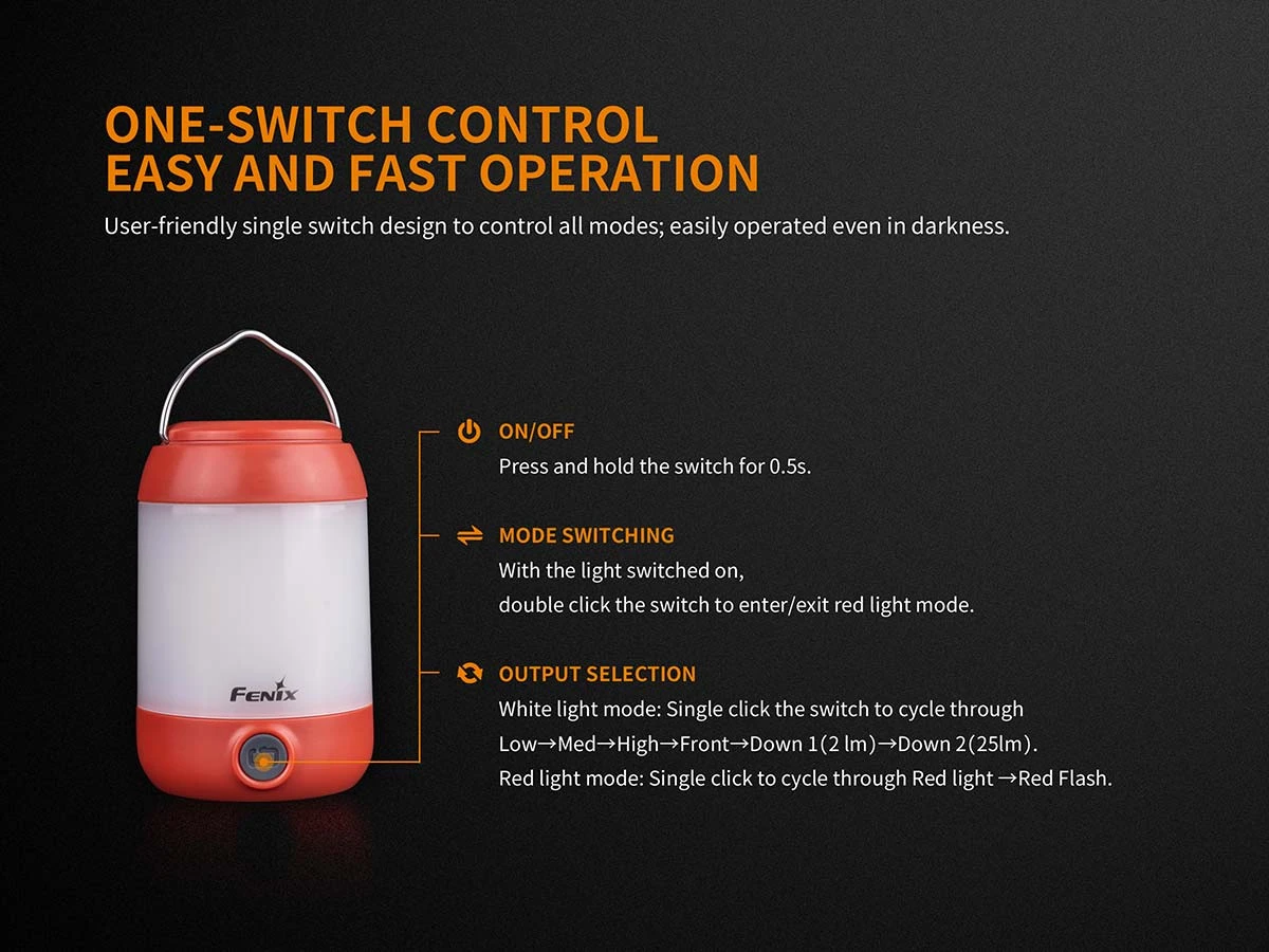 The Fenix CL23 Lantern is a multi-directional, lightweight camping lantern. Powered by AA batteries this lantern delivers a max output of 300 lumens—plenty of light to illuminate your entire campsite. A unique feature of the lantern is the multi-directional lighting modes—three brightness levels of 360 degree light, a front light and two brightness levels of down light. Don’t have enough batteries? Power the CL23 with only one or two batteries in an emergency situation. Durable and rain-resistant this lantern a perfect camp companion.