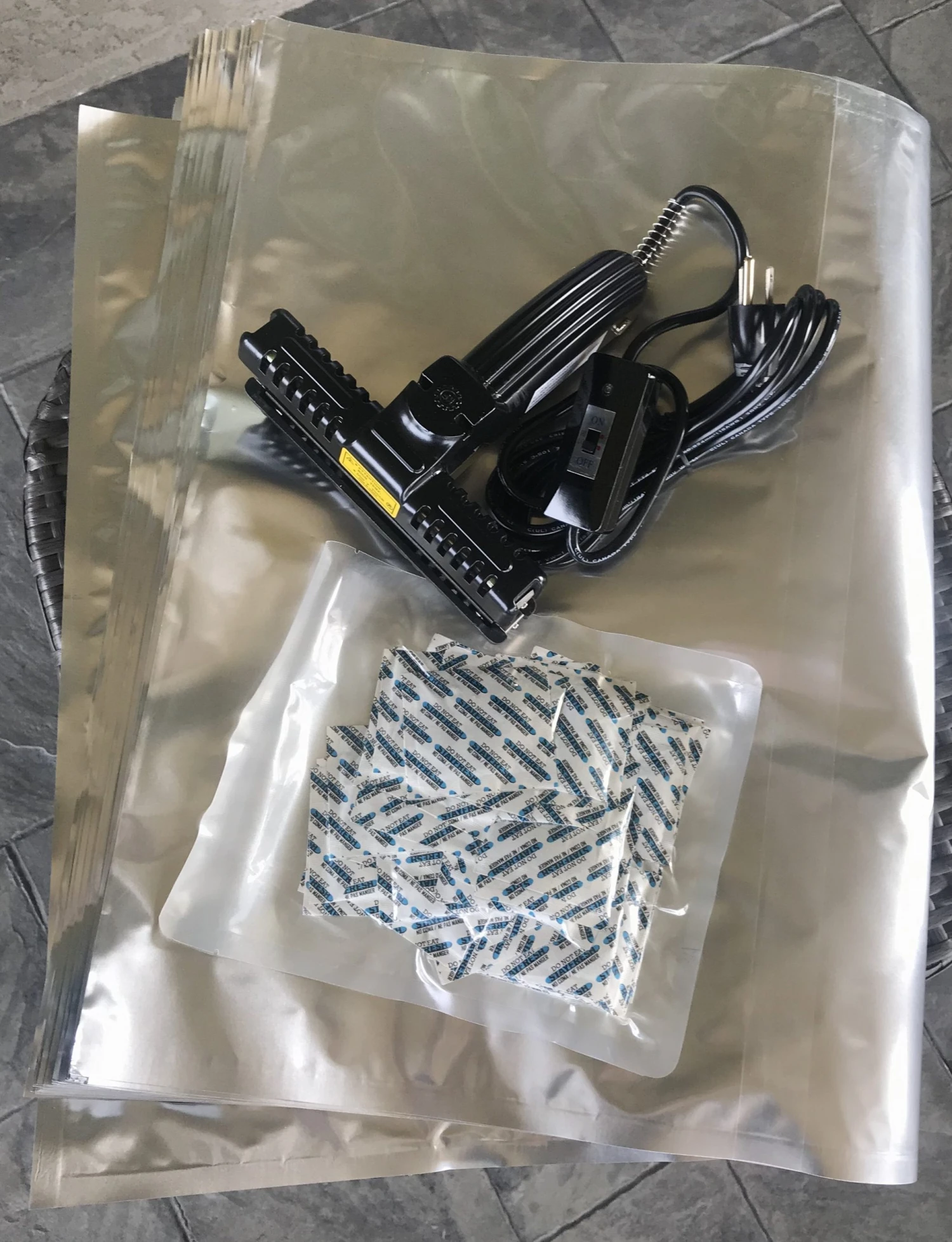 This starter kit comes with everything you need to get set up for mylar bag storage. Including 25 Mylar bags – 5 Gallon, 100 500cc oxygen absorbers, and a 6″ portable bag sealer.