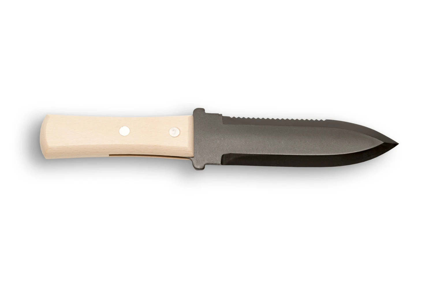 Traditionally used in Japan to collect specimens for bonsai, the knife has a heavy steel blade that is dished, with a serrated edge on one side and a sharpened edge on the other.
