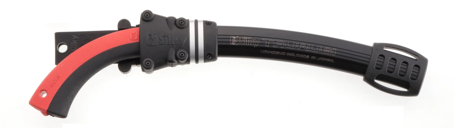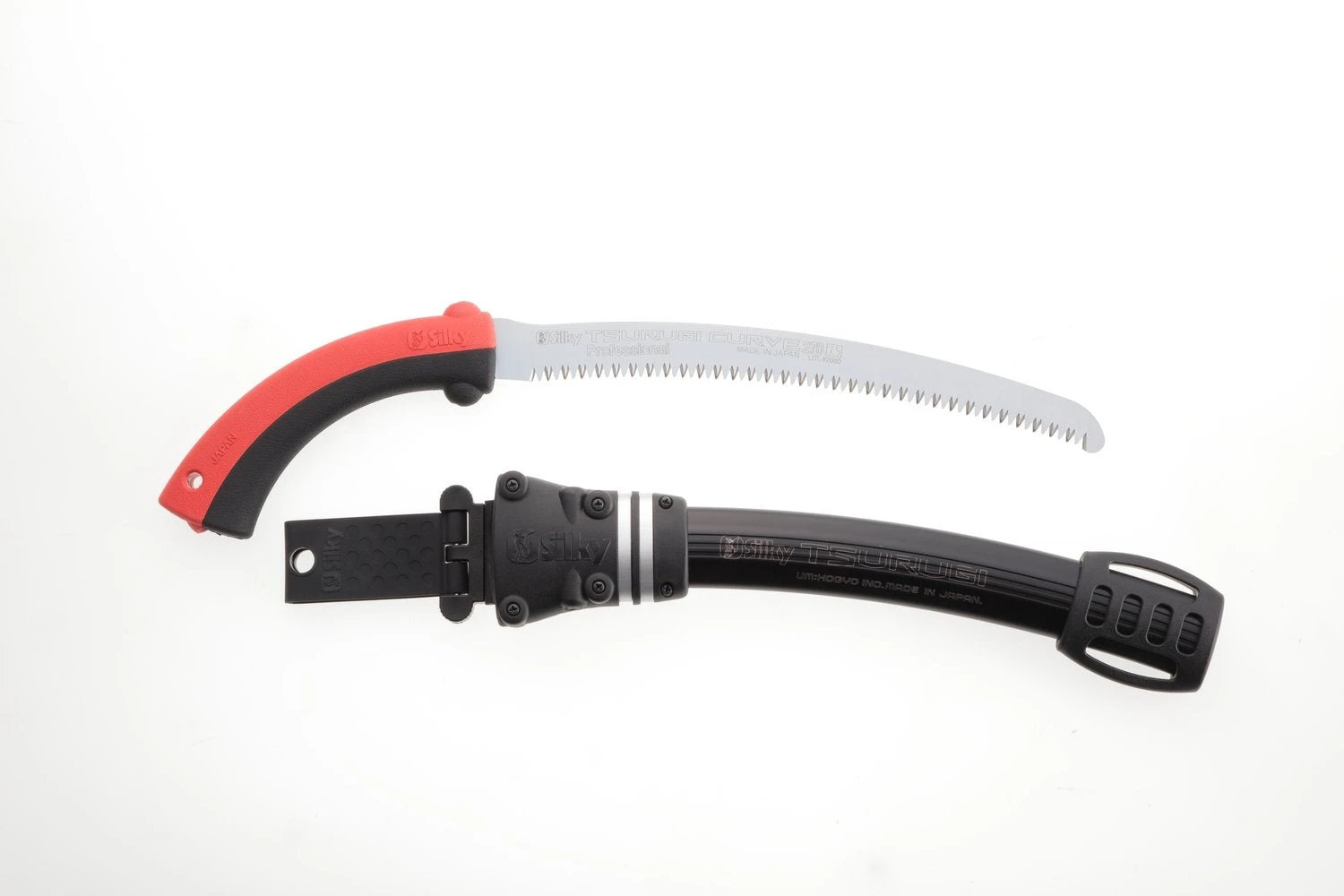 The Tsurugi Curve is similar to the uniquely designed straight Tsurugi, but is a much more aggressive impulse-hardened blade in popular sizes which will still fit into tight crotches without damage to opposing limbs. The Tsurugi is possibly the lightest weight, best balanced “big saw” ever produced, having no handle screws, nuts or extraneous hardware to keep it together. The comfortable, 2-part rubber grip is held together by an ingenious integration with the full tang blade. The Tsurugi Curve comes in a unique aluminum scabbard that can be attached to the belt or leg, depending on the users preference, and has eight rollers protecting the entryway.