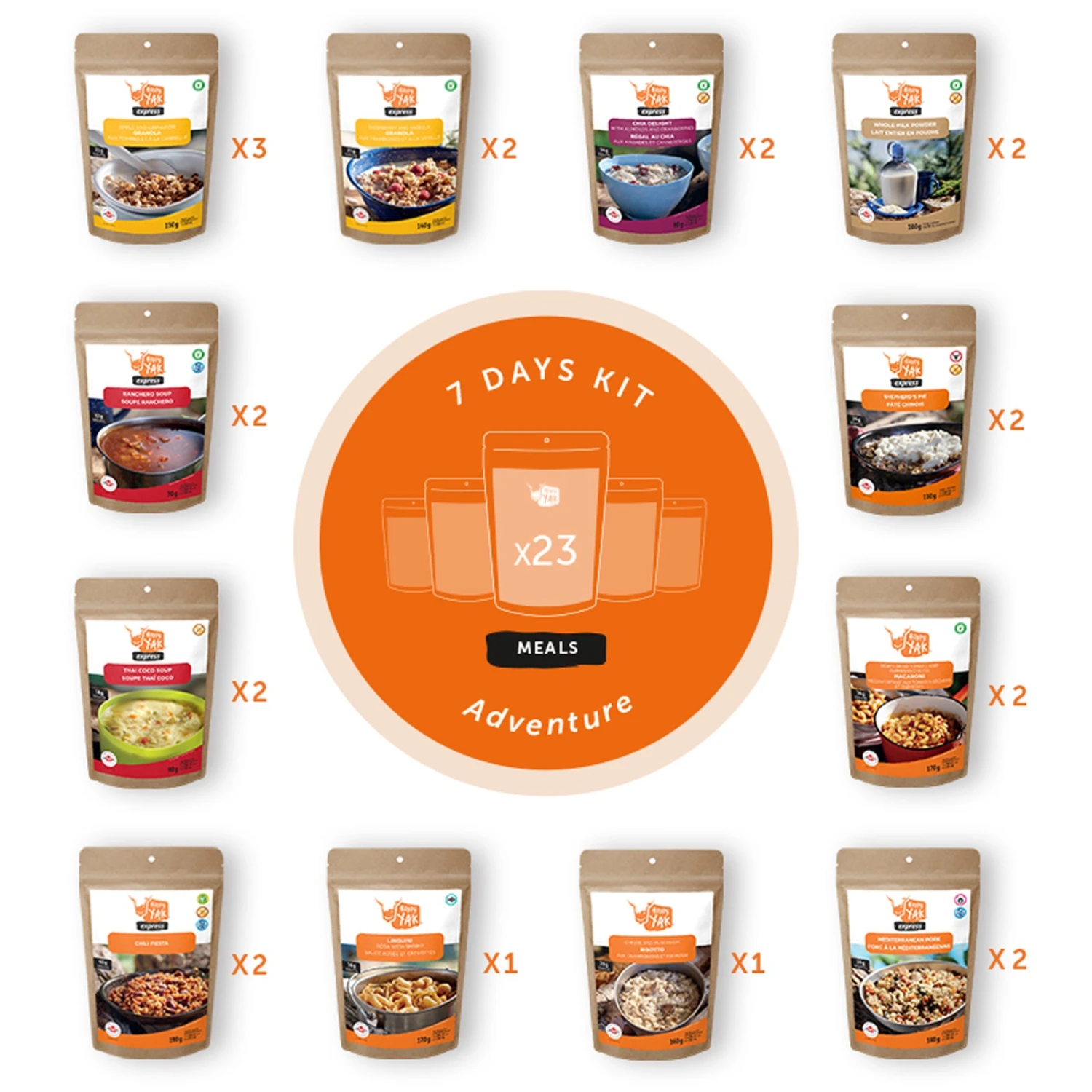The ultimate kit for a short expedition or as a backup supply! The 7 days kit contains a variety of meals including breakfasts, soups and meals. Bonus: Two bags of whole milk powder for your cereal or your best homemade recipes! High in protein with a total of 619g and 12,300 calories, the 7 Days Kit – Adventure will give you the energy you need. Enough to fuel you no matter what the situation!Â