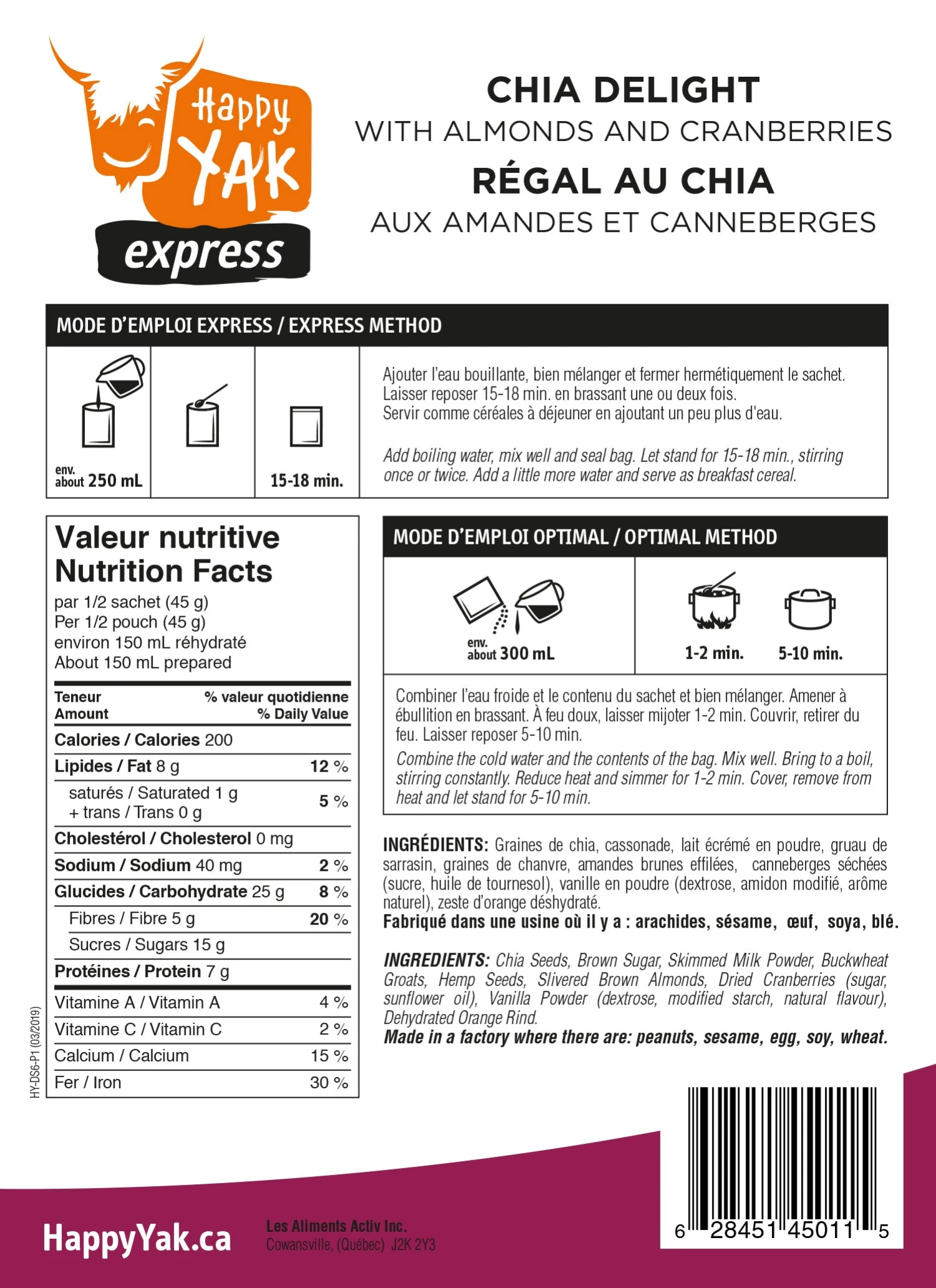 A quick, delicious and nutritious delight! Chia has many nutritional virtues, including high sources of fiber, omega-3s and protein. Let yourself be tempted by this Chia Delight with almonds and cranberries, you deserve it! Cold or hot, you’ll see, you’ll love it!