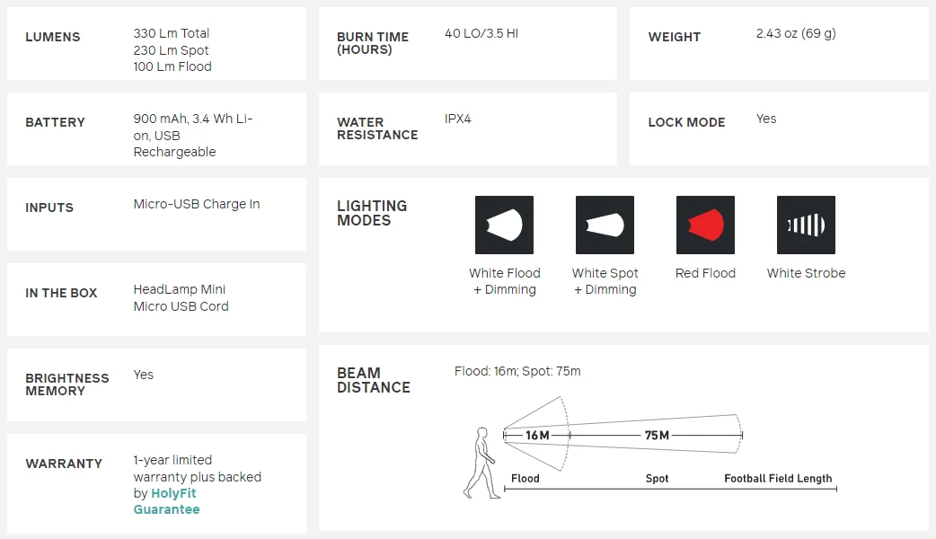- Spot Lens – Great for task lighting or illuminating your path, up to 230 Lm
