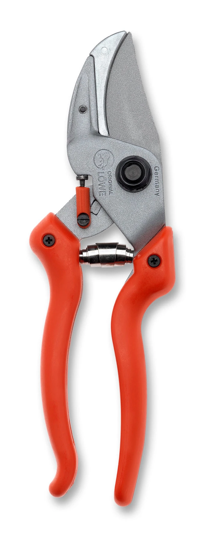 The LOWE 8.104 is a new Curved blade anvil pruner that combines the benefits of both anvil and bypass pruners. With its durable anvil, the LOWE 8.104 is able to easily cut through harder woods while still maintaining the curved bypass blades which prevent material from slipping out of the pruners. At the same time, unique adjustable handles ensure a perfect fit for either the left or right hand of any size from medium to large.