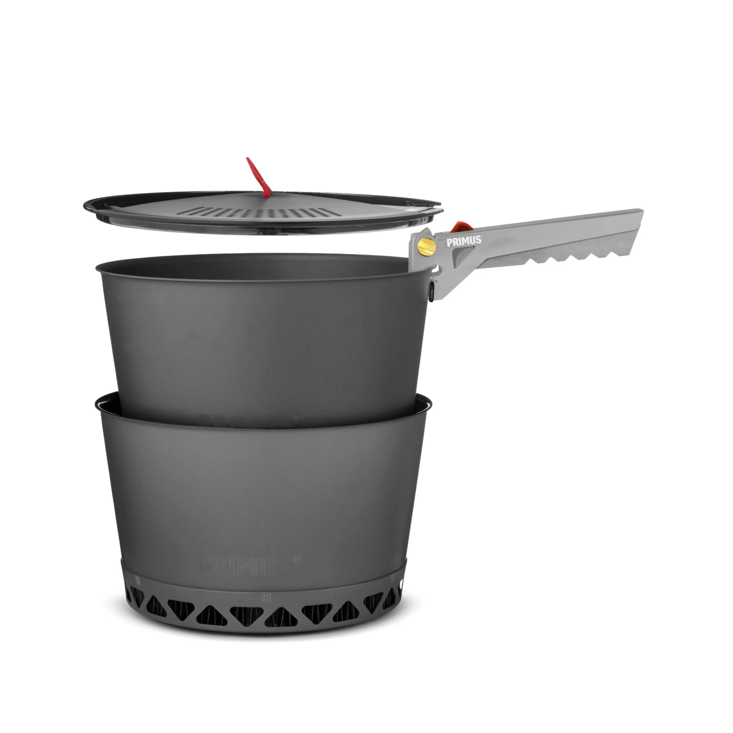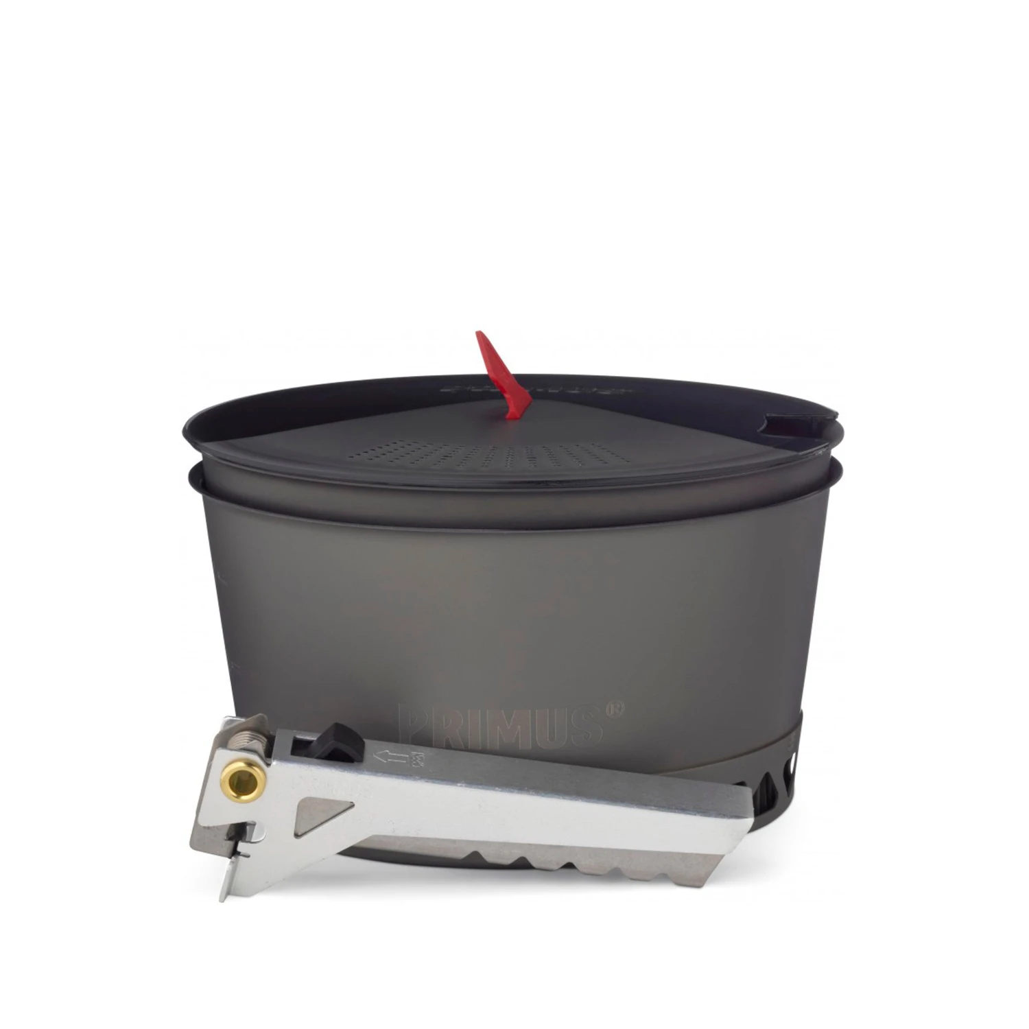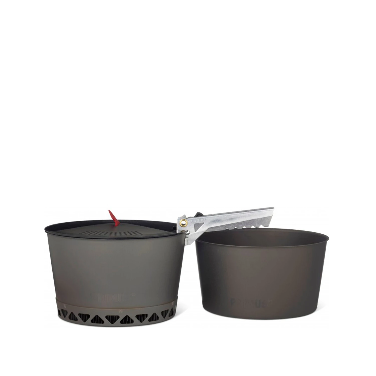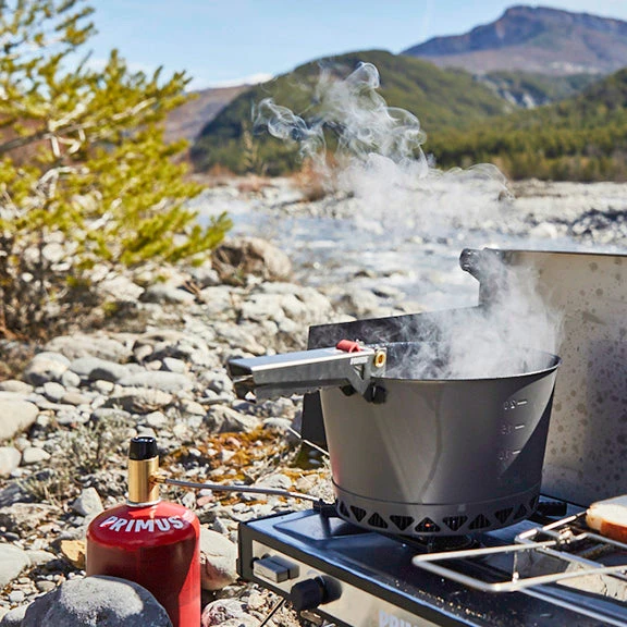 The PrimeTech pot is made of hard anodized aluminum, which has good heat distribution and does not rust. It also has a ceramic non-stick coating on the inside, which facilitates the cooking and cleaning. The second pot is made of hard anodized aluminum, with a traditional design without heat exchanger. Both of the pots are 1.3 liters, good for 1-3 people. A transparent lid in Tritan reg; with an integrated strainer and heat-resistant silicone handles which make it easier to take care of certain tasks such as pouring pasta water. The smart gripping tongs are as steady as a fixed handle and flexible as a conventional gripper and can be locked in the pan for easy and safe handling. Our Prime Tech pots work well with all of our stoves.