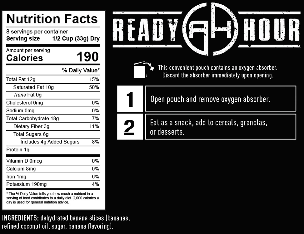 Plan ahead for times when you need an immediate source of energy with our naturally sweetened crispy and fresh banana chips. Ready Hour Banana Chips are a delicious and nutritious, yet they are light and easy to pack and take with you on the go. They will last up to 10 years unopened, and one year once you open the can. Store it in a cool, dry location where temperatures stay between 55 and 75 degrees for optimal longevity.