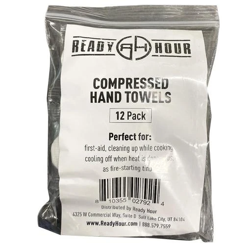 Compact disposable towels for camping, travel or emergencies. Each of these Ready Hour packages contains 12 compressed towels.