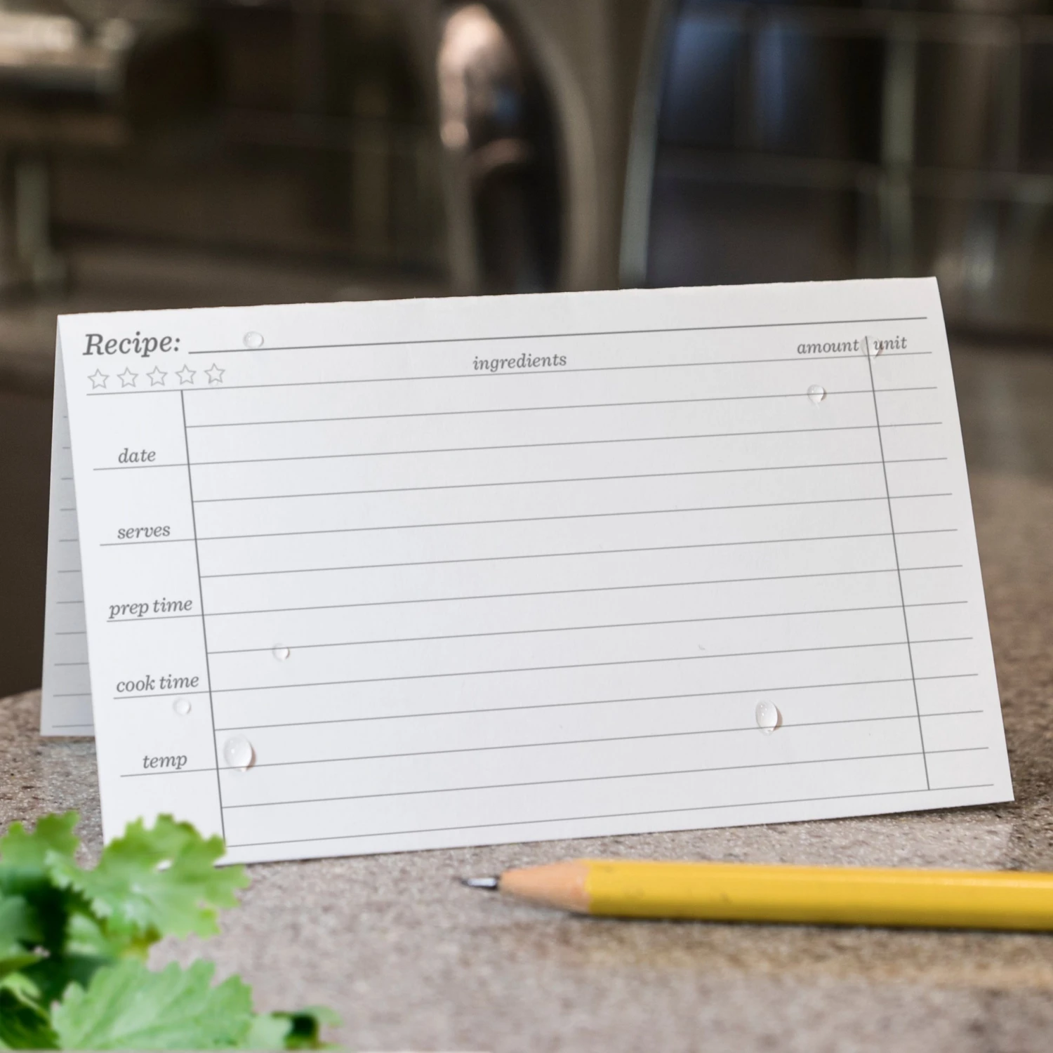 Protect your favourite recipes from the hazards of the kitchen with Rite in the Rain splash-proof recipe cards. These folded 6X5 cards feature heavyweight, archival-grade, water-resistant stock that stands up to grandma’s Bolognese Sauce and to years in storage. A simple design stays out of the way of your instructions and the folding cards make for easier filing, reading in the kitchen, or even bringing in your pocket to the grocery store.