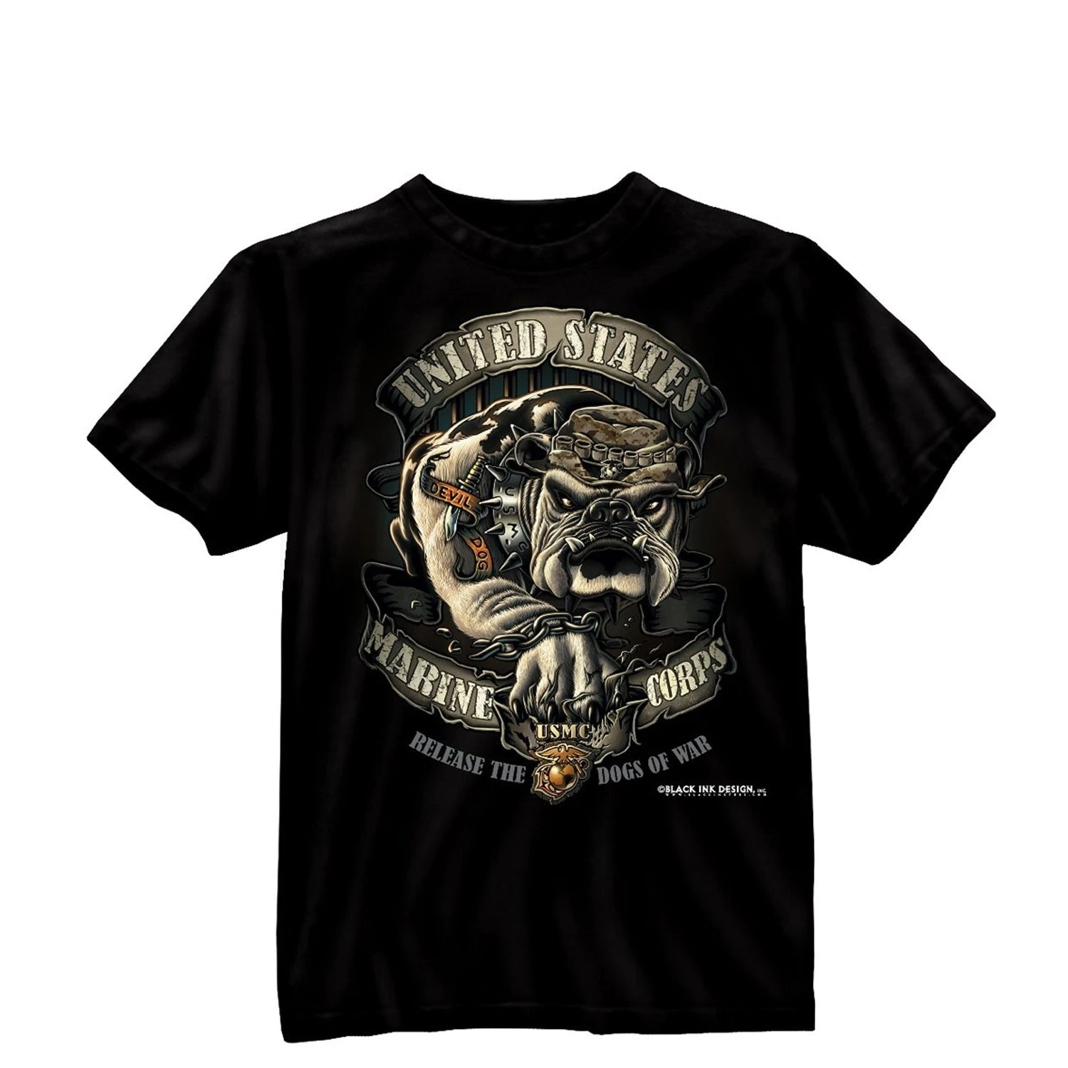 Black Ink’s U.S.M.C. Bulldog t-shirt is a heavyweight, cotton and pre-shrunk tee. The graphic military t-shirt is a two-sided print t-shirt that is available in sizes S to 2XL. Officially licensed by the United States Marine Corps.