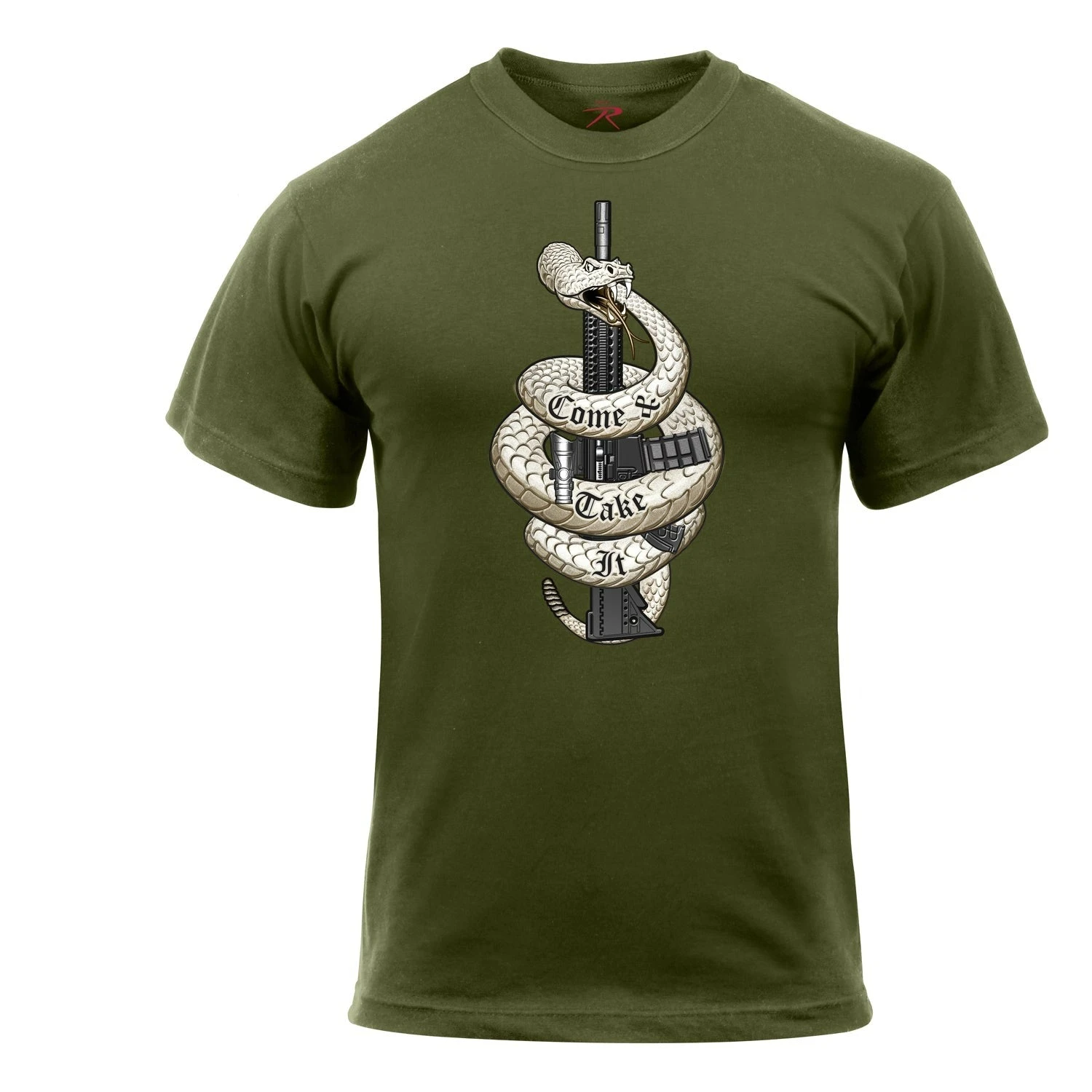 Rothco’s “Come & Take It” printed graphic t-shirt is a comfortable cotton/poly blended material. The front graphic features the iconic expression of defiance “Come and Take It” with a detailed image of a rifle and snake.