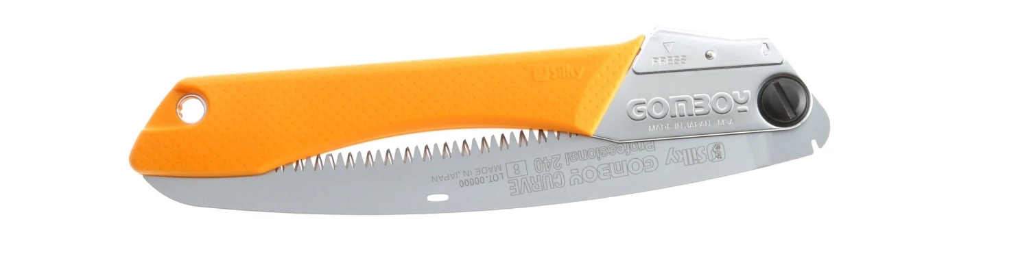 This folding saw with curved blade is ideal for pruning, camping, or hunting.