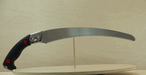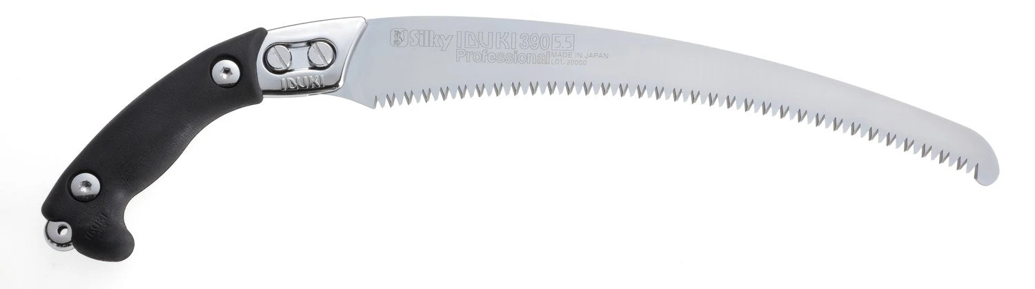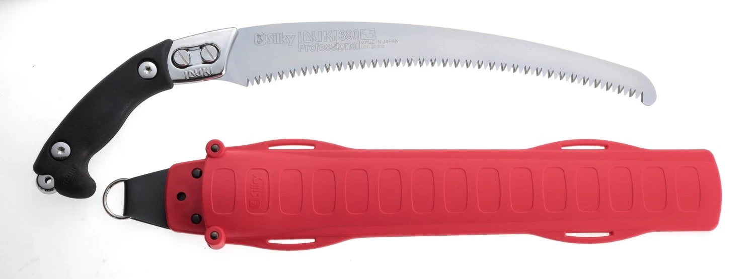 Best-selling, heavy-duty, professional hand saw with a very well-balanced 15-2/5-inch, curved fixed blade. Large, comfortable sure-grip handle gives strength and flexibility to the full length of the saw. Curved blade provides a greater cutting speed with less effort. Utilizes proprietary Silky 4-RETSUME (Four Rows of Teeth) Technology. Teeth are set in such a way that there appears to be 4 rows of them. Ideal for the toughest pruning jobs! The heavy duty blade with precision-ground, razor-sharp, 5.5 teeth per inch is designed to cut on a pull stroke and provides fast, clean and extremely smooth cutting action. Superbly designed comfortable rubber hand grip absorbs vibration while cutting and provides excellent control over the full length of the saw. The hard chrome-plated blade resists rust and effects of tree resin, and wipes clean easily. Great combination of high performance blade with a comfortable sure-grip handle that really sticks in your hands. Exceptional design, strength, balance and superior finish quality. Comes with a custom black polypropylene sheath equipped with both ring and belt strap attachments that can be used on the left and right side and allow attachment to a tree saddle using carabiner. Suitable for serious pruning tasks and ideal for aggressive cutting and efficient chip removal. Made in Japan.