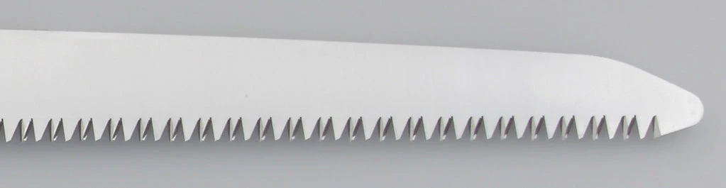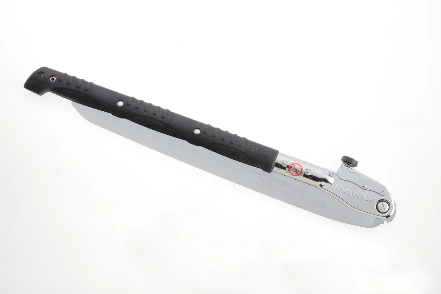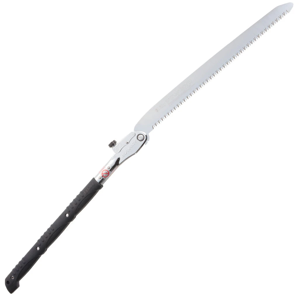 Two-handed, professional, heavy-duty folding saw with a 19-4/5 inch blade. Can easily compete with a chainsaw! Compared with the Katana, the legendary Japanese samurai sword, it is the largest folding saw on the market today. The long, well-balanced, taper-ground blade with an impulse-hardened, non-set tooth design provides extended working reach, faster cutting and handles large limbs and trunks with no effort. The non-slip, two-handed, rubberized cushioned handle provides a sure and comfortable grip even in the most difficult operating conditions. Suitable for serious tasks like cutting large timber and tree trunks. Exceptional design, strength, balance and superior finish quality. Comes with a sturdy nylon shoulder bay with Velcro fastening and a pocket for replacement blades. Made in Japan.