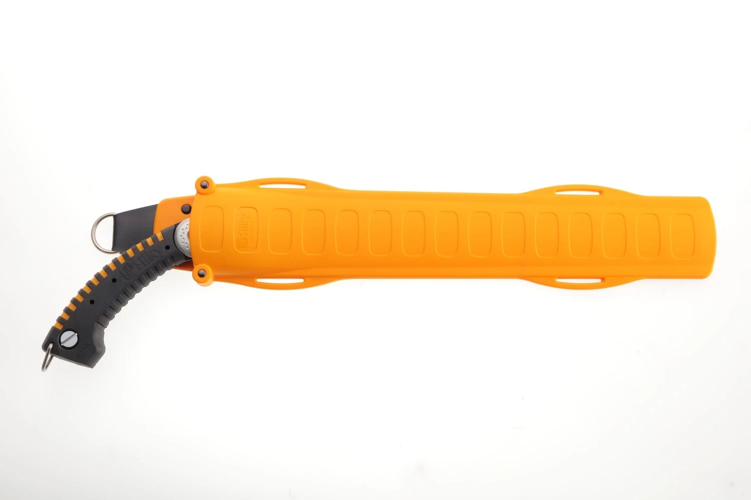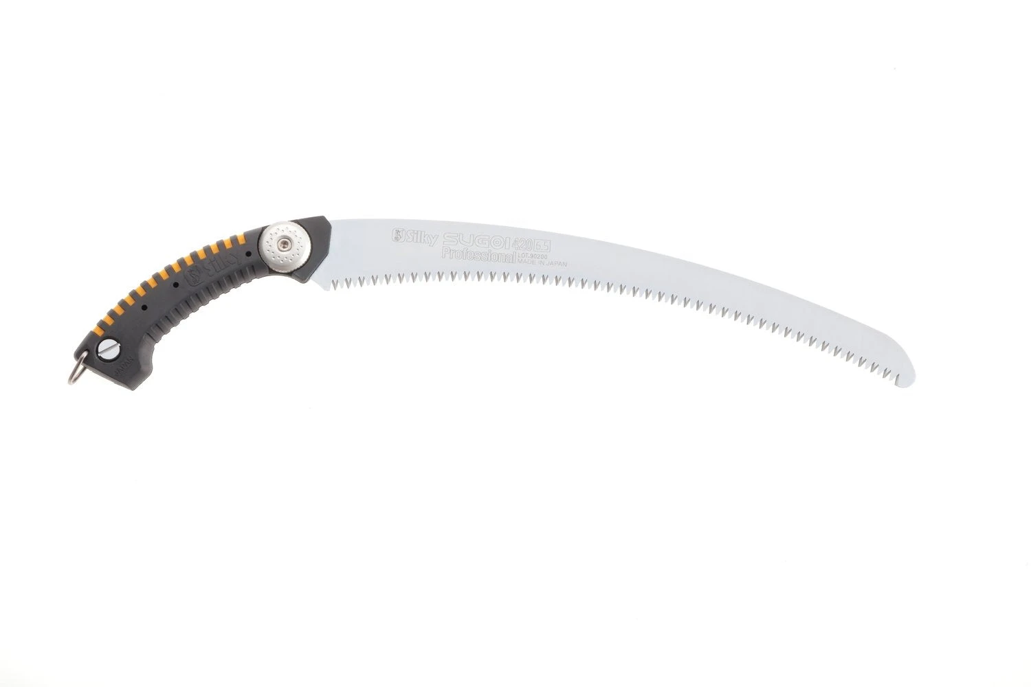 Best-selling, state-of-the-art, professional hand saw with razor-sharp and ultra-fast cutting mono-constructed 16-1/2-inch curved blade. Curved blade provides greater cutting speed with less effort. Large and comfortable sure-grip handle gives strength and flexibility to the full length of the saw. The super aggressive tooth pattern is ideal for pruning large limbs. Utilizes proprietary Silky MIRAI-ME (Smooth Cutting) Technology – The Teeth of the Future! The precision-ground, razor-sharp teeth with four cutting angles provide extremely fast, clean and smooth cutting action. Features hard, chrome-plated, taper-ground curved blade with non-set tooth design. Taper-ground profile reduces drag and directs more usable energy to the cutting edge. The hard chrome-plated blade has 5.5 teeth per inch, resists rust and effects of tree resin, and wipes clean easily. Superbly designed molded-rubber hand grip encases the blade extension to absorb vibration while cutting. Great combination of high performance blade with a comfortable sure-grip handle that really sticks in your hands. Exceptional design, strength, balance and superior finish quality. Comes with the custom, high-visibility, yellow plastic scabbard that can be attached to the belt or lower leg. Ideal for pruning large limbs on the ground or at height. Made in Japan. SUGOI is available in two blade lengths: 14-1/5-inch (360 mm) and 16-1/2-inch (420 mm).