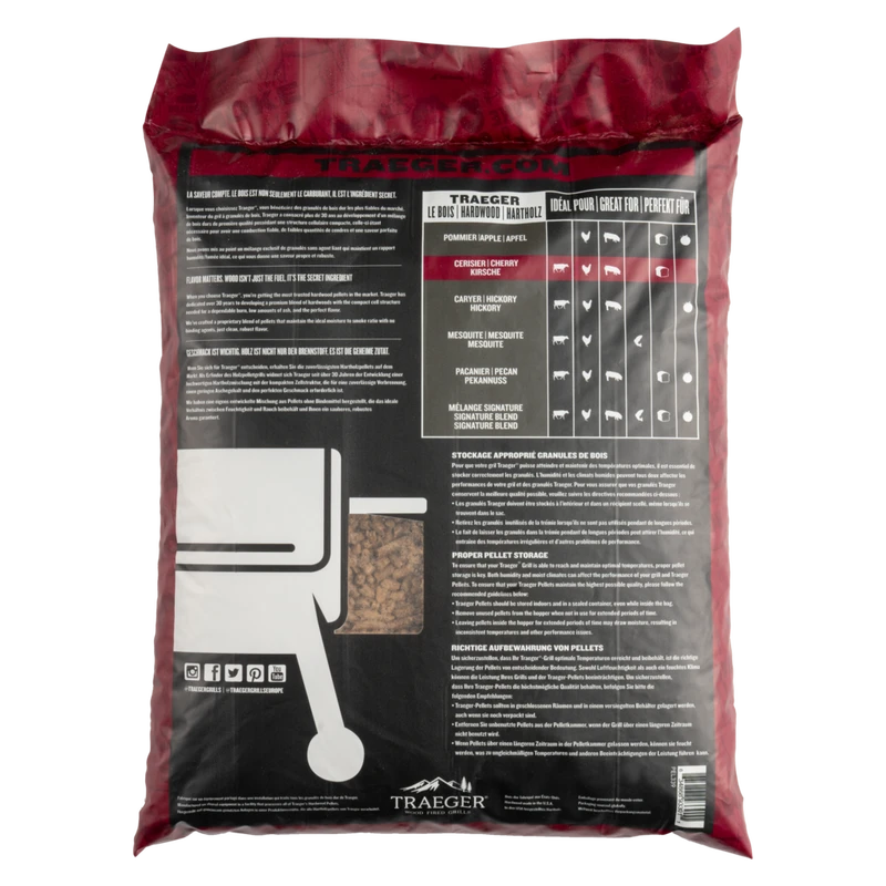 Only Traeger can guarantee that nothing harmful is cooking your food. With our 100% all-natural wood pellets, fuel the fire for memorable food kissed by robust wood smoke. We keep our smoke to moisture ratio consistently at 5%—the perfect spot for optimal burn. With Traeger Cherry pellets, naturally enhance Beef, Chicken, and Pork with a subtly sweet, fruity flavour.