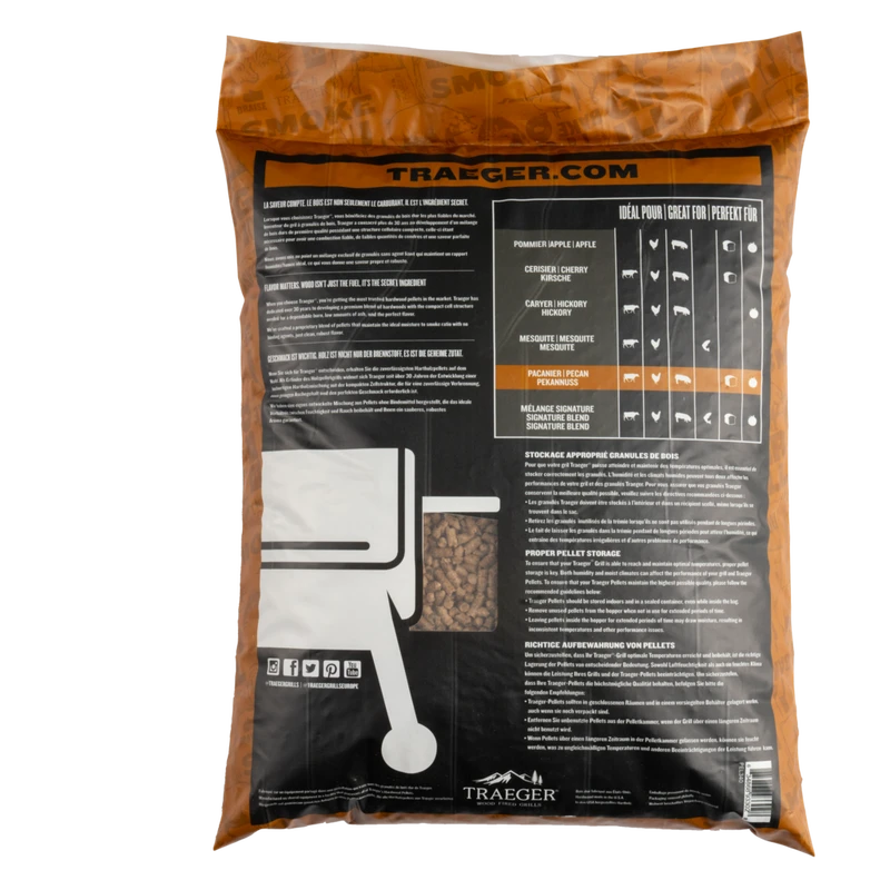 Our expertly crafted, all-natural Pecan hardwood burns slow and steady every time. The Traeger moisture to smoke ratio stays at 5% (aka, the sweet spot), which means your food gets a thick and even lick of flavorful smoke. This fuel is the right choice for naturally augmenting your chicken, vegetables, beef, and pork with a sweet, spicy, assertive flavour.